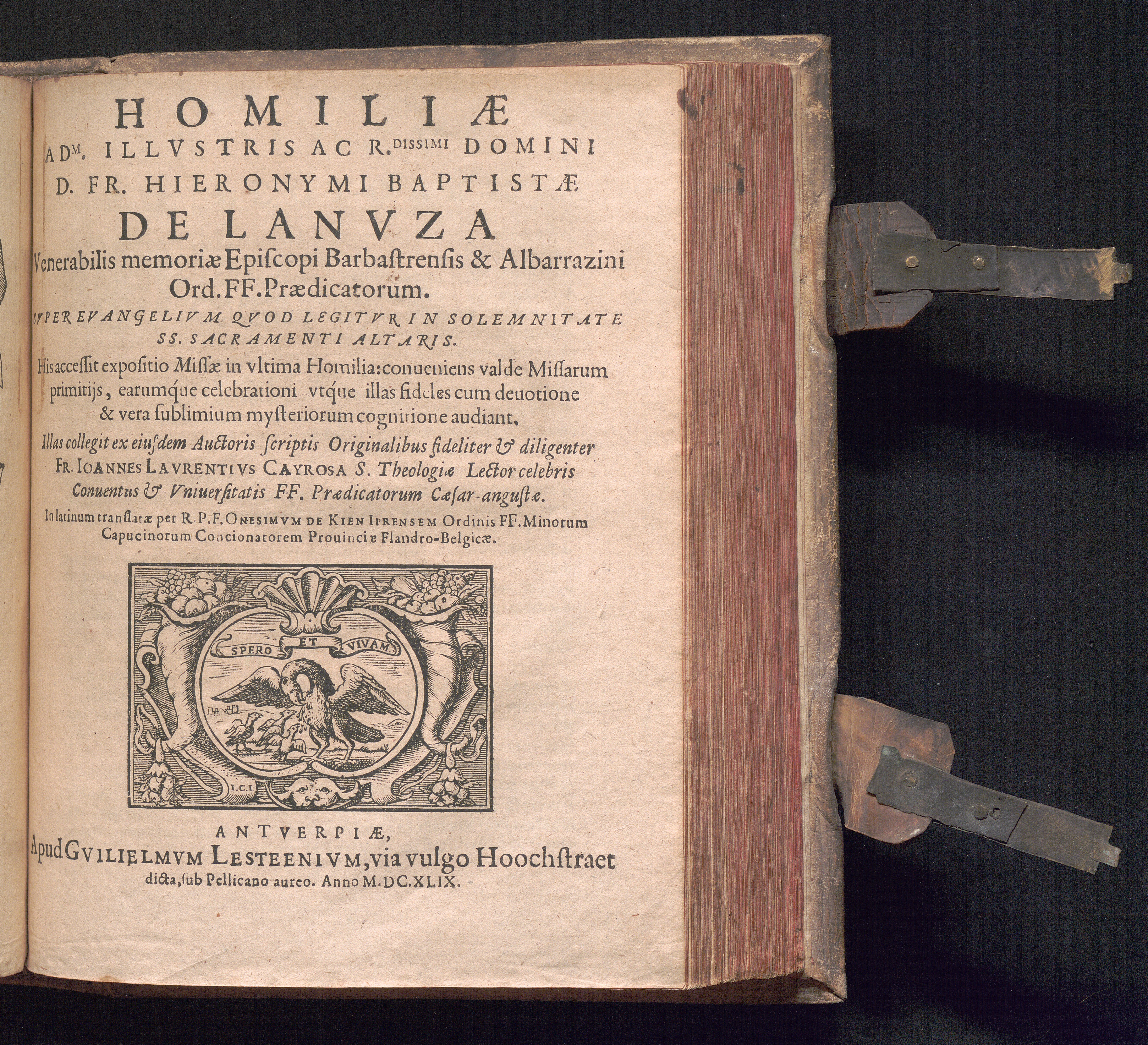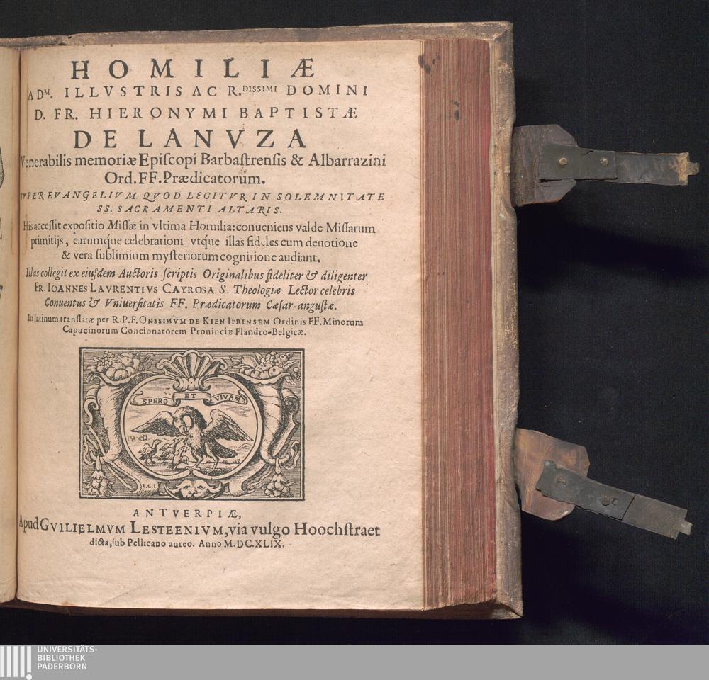 Homiliæ Adm. Illvstris Ac R.dissimi Domini D. Fr. Hieronymi Baptistæ De Lanvza Venerabilis memoriæ Episcopi Barbastrensis & Albarrazini Ord. FF. Prædicatorum : Svper Evangelivum Qvod Legitvr In Solemnitate SS. Sacramenti Altaris. His accessit expositio Missæ in vltima Homilia: conueniens valde Missarum primtijs, earumque celebrationi vtque illas fideles cum deuotione & vera sublimium mysteriorum cognitione audiant / Illas collegit ex eiusdem Auctoris scriptis Originalibus fideliter & diligenter Fr. Ioannes Lavrentivs Cayrosa S. Theologiæ Lector celebris Conuentus & Vniuersitatis FF. Prædicatorum Cæsar-angustæ. In latinum translatæ per R.P.F. Onesimvm De Kien Iprensem Ordinis FF. Minorum Capucinorum Concionatorem Prouinciæ Flandro-Belgicæ
