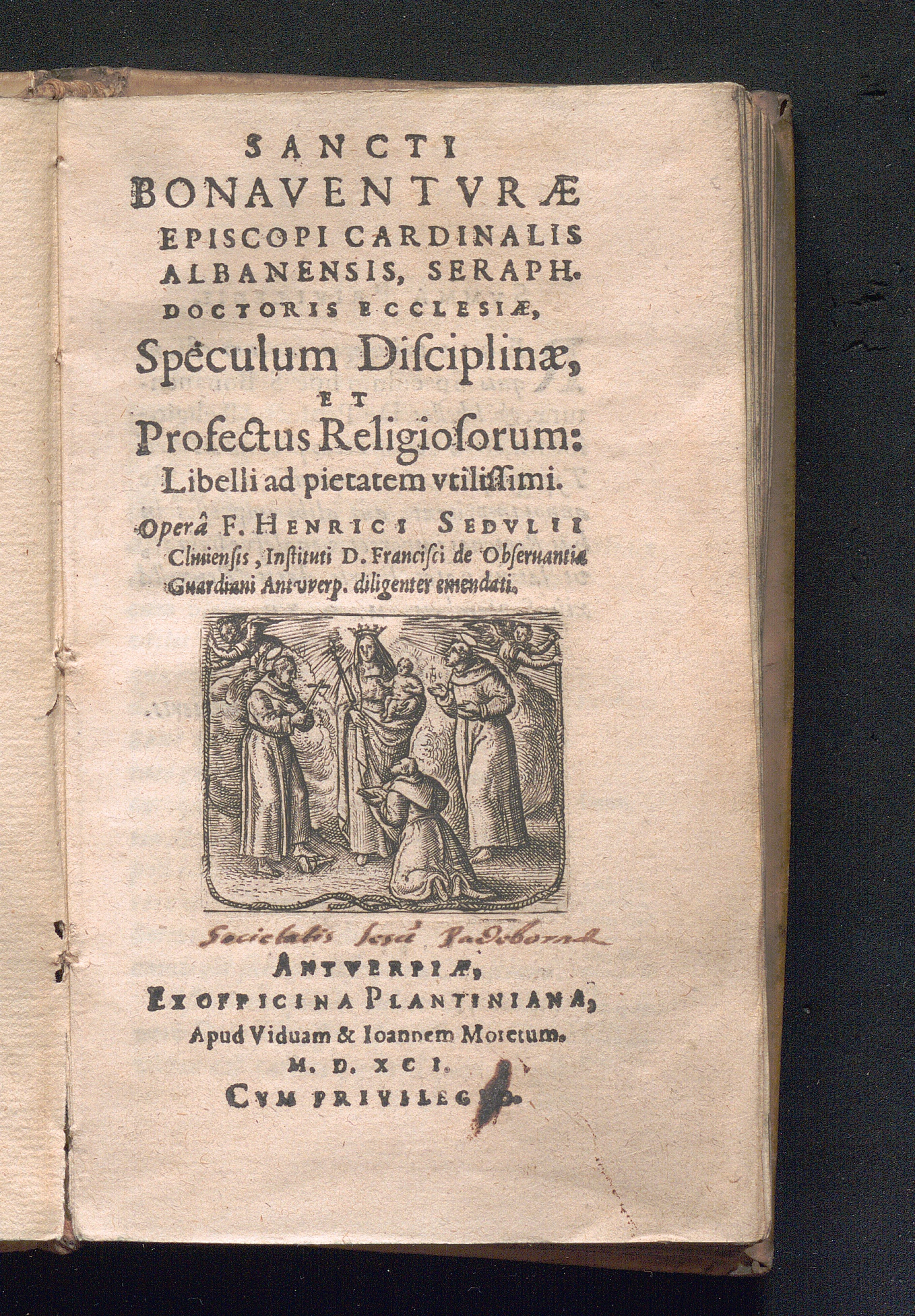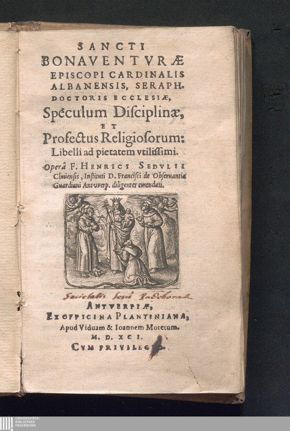 Sancti Bonaventvræ Episcopi Cardinalis Albanensis, Seraph. Doctoris Ecclesiæ, Speculum Disciplinæ, Et Profectus Religiosorum: Libelli ad pietatem vtilissimi / Operâ F. Henrici Sedvlii Cliuiensis, Instituti D. Francisci de Obseruantia Guardiani Antvverp. diligenter emendati