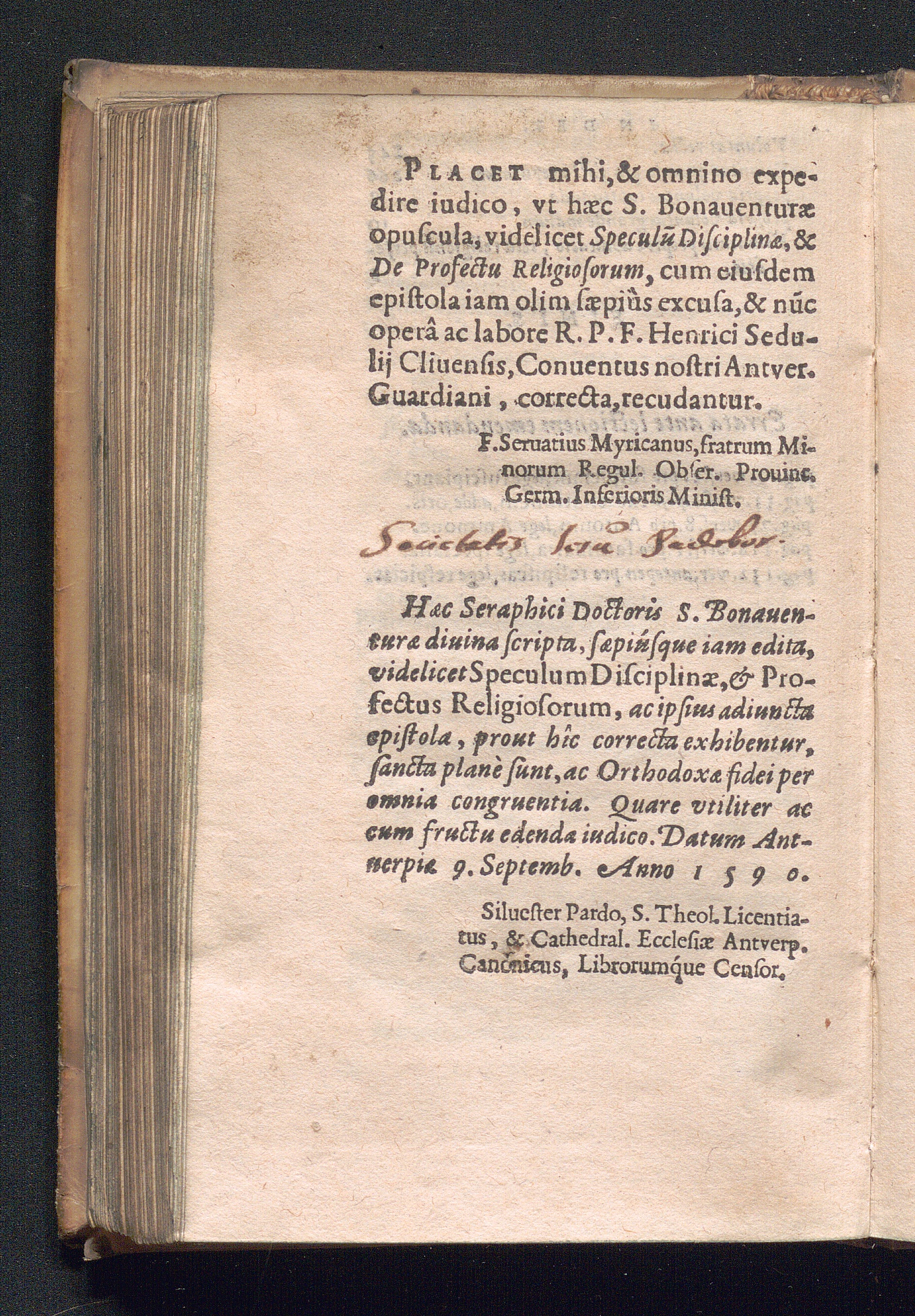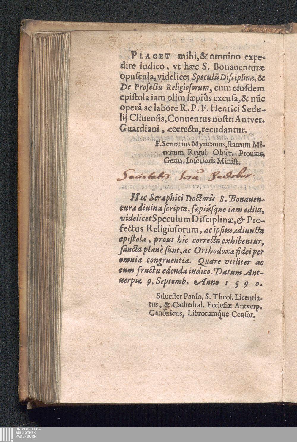 Sancti Bonaventvræ Episcopi Cardinalis Albanensis, Seraph. Doctoris Ecclesiæ, Speculum Disciplinæ, Et Profectus Religiosorum: Libelli ad pietatem vtilissimi / Operâ F. Henrici Sedvlii Cliuiensis, Instituti D. Francisci de Obseruantia Guardiani Antvverp. diligenter emendati