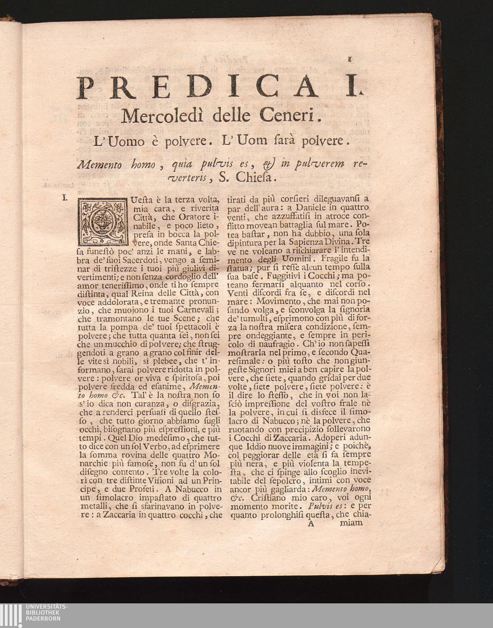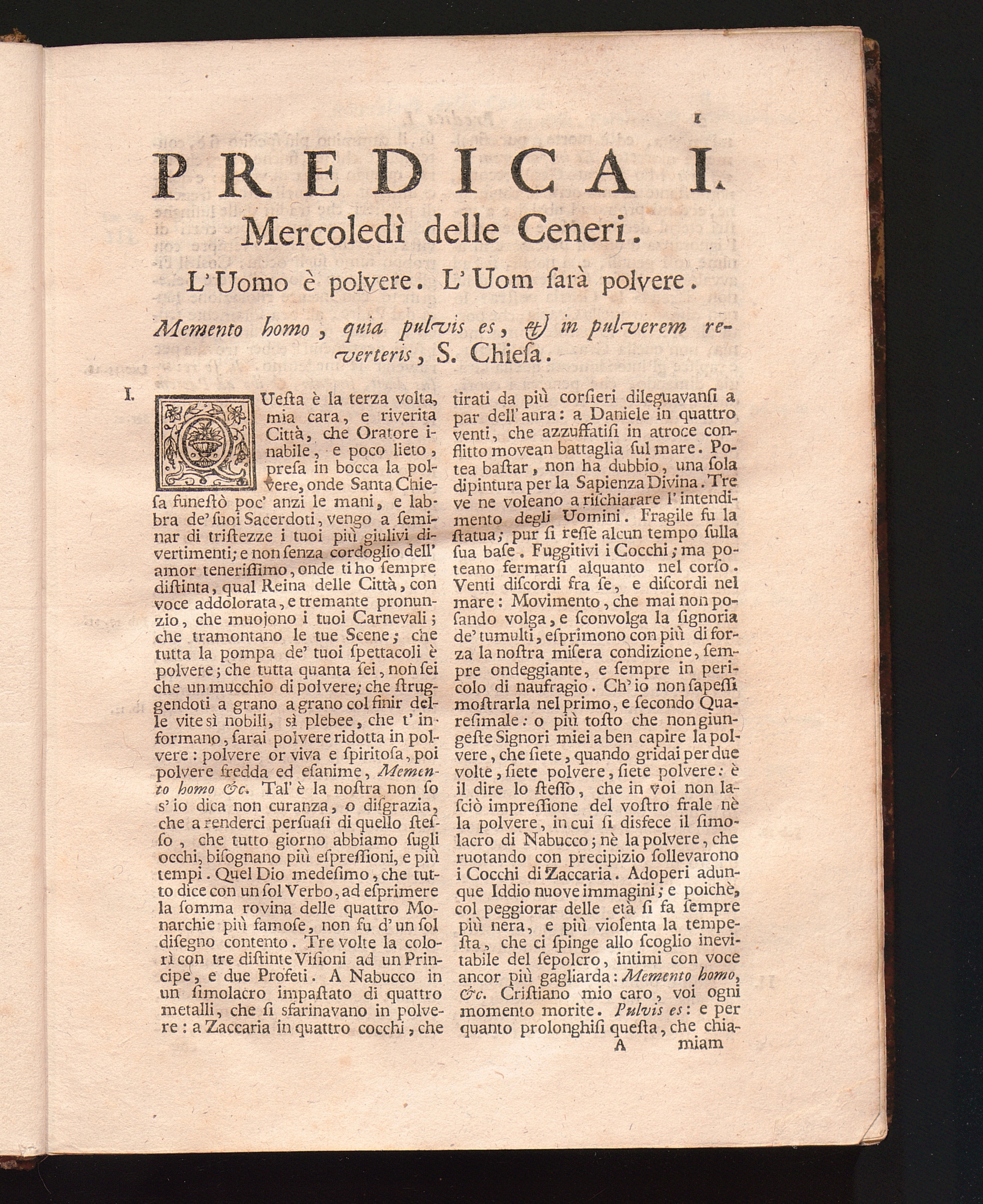 Predica I. Mercoledì delle Ceneri. L'Uomo è polvere, l'Uom farà polvere.