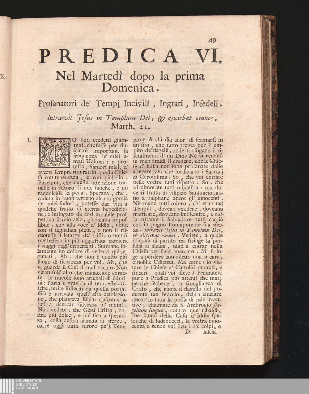 Predica VI. Nel Martedì dopo la Prima Domenica. Profanatori de'Tempi Incivili, Ingrati,[...]