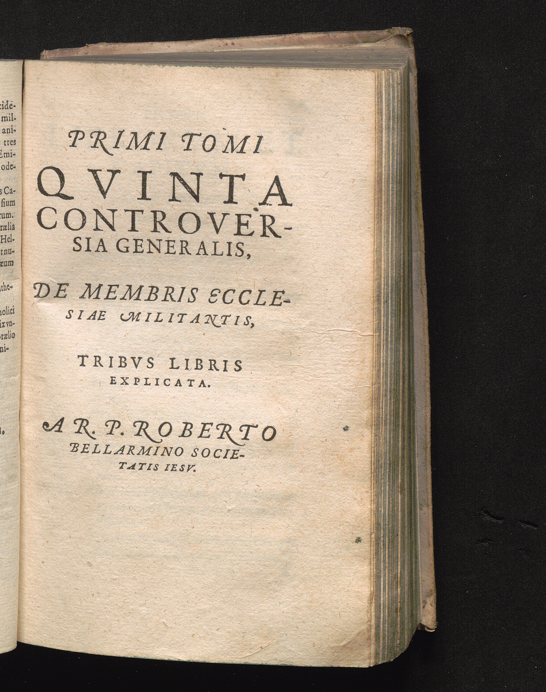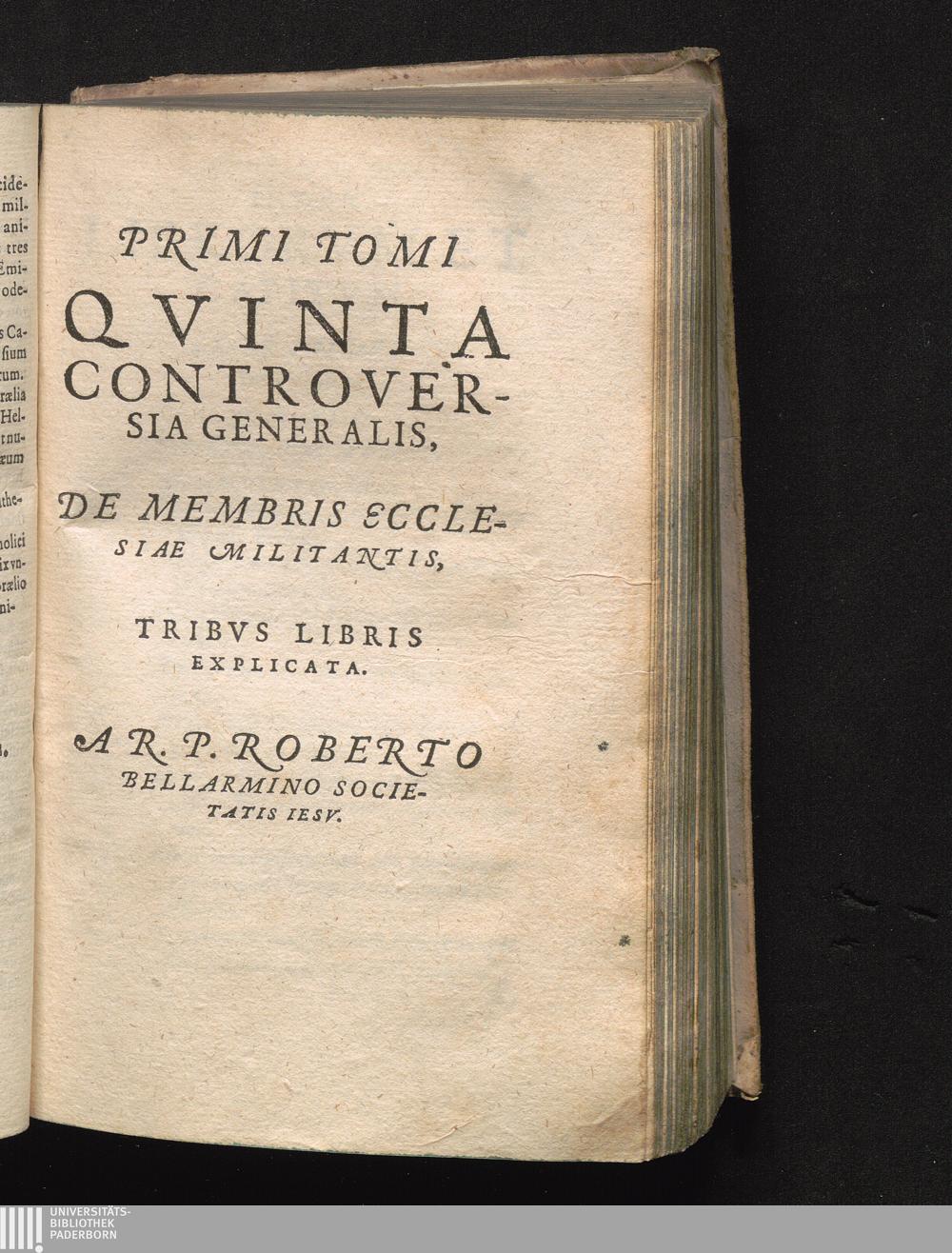 PRIMI TOMI|| QVINTA|| CONTROVER-||SIA GENERALIS,|| (1599) DE MEMBRIS ECCLE-||SIAE MILITANTIS,|| TRIBVS LIBRIS|| EXPLICATA.||