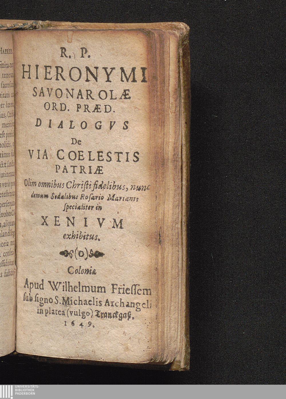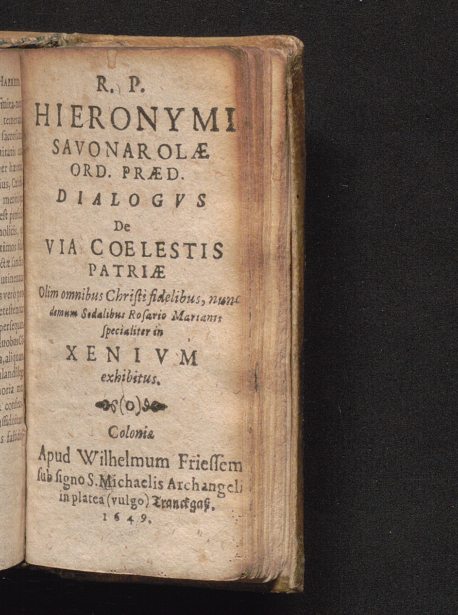 R. P. Hieronymi Savonarolæ Ord. Præd. Dialogvs De Via Cœlestis Patriæ : Olim omnibus Christi fidelibus, nunc demum Sodalibus Rosario Marianis specialiter in Xenivm exhibitus.