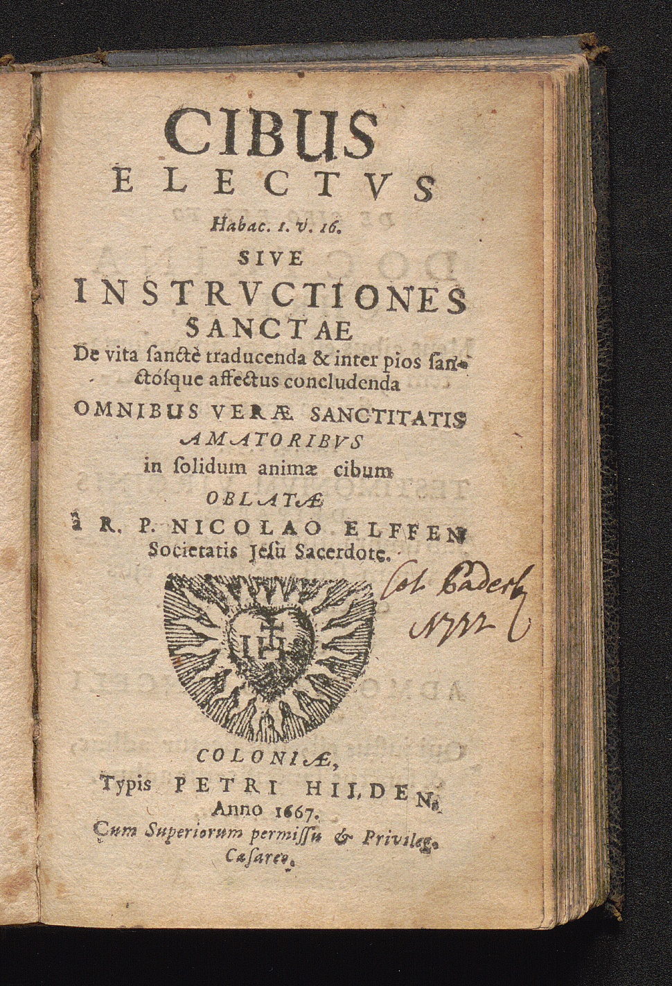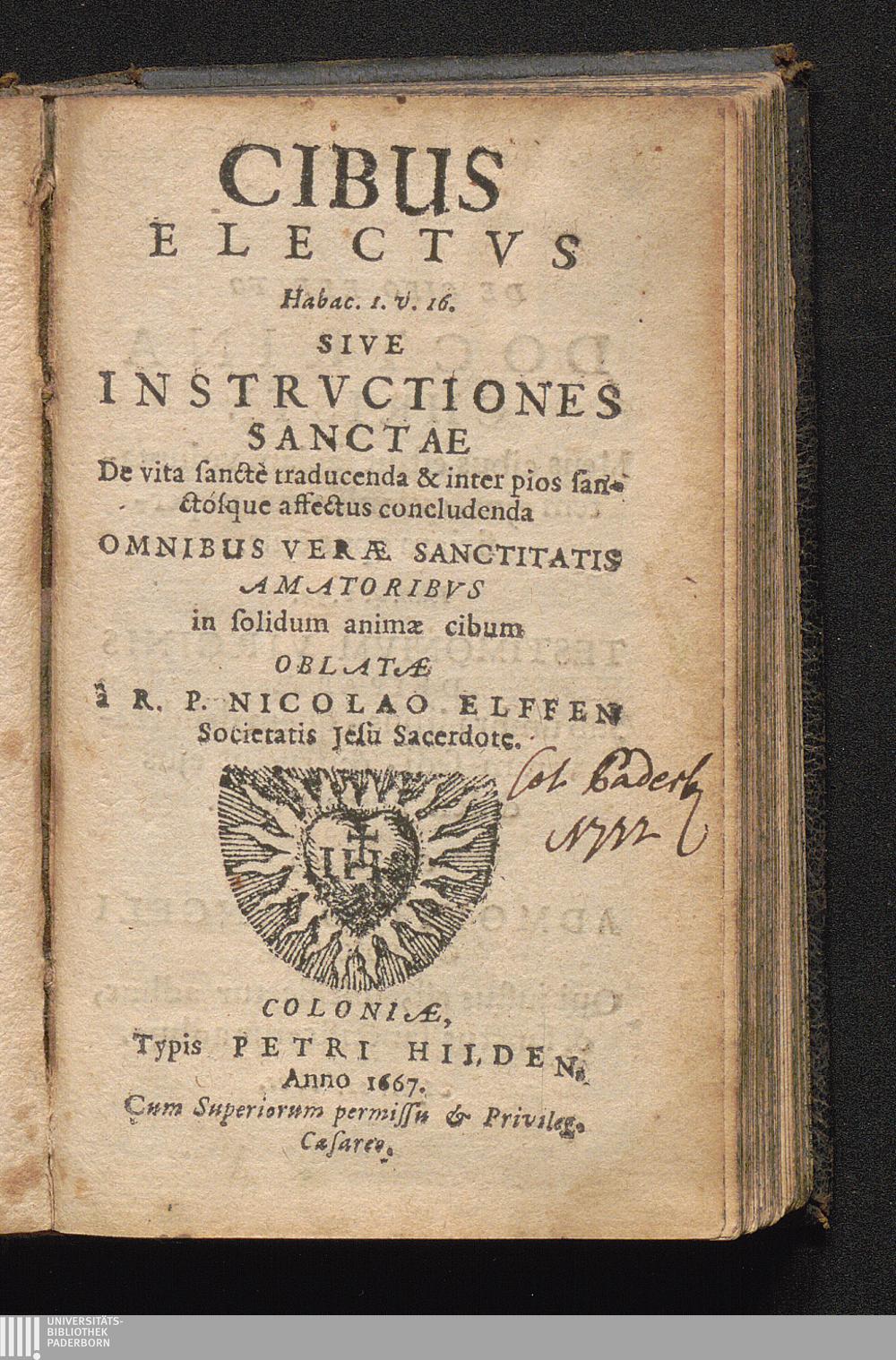 Cibus Electvs Sive Instrvctiones Sanctae De vita sanctè traducenda & inter pios sanctósque affectus concludenda / Omnibus Veræ Sanctitatis Amatoribvs in solidum animæ cibum Oblatæ a R. P. Nicolao Elffen Societatis Jesu Sacerdote