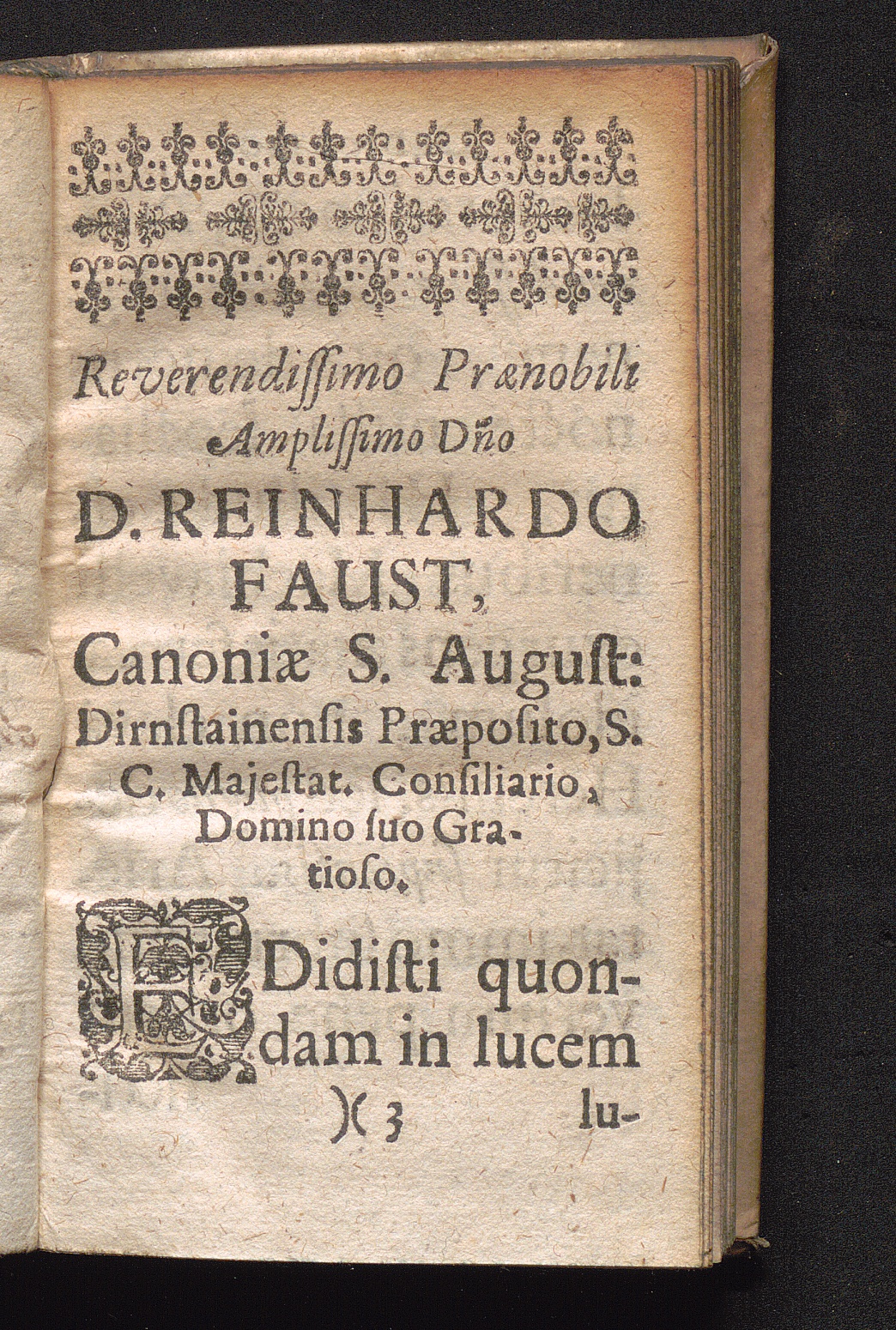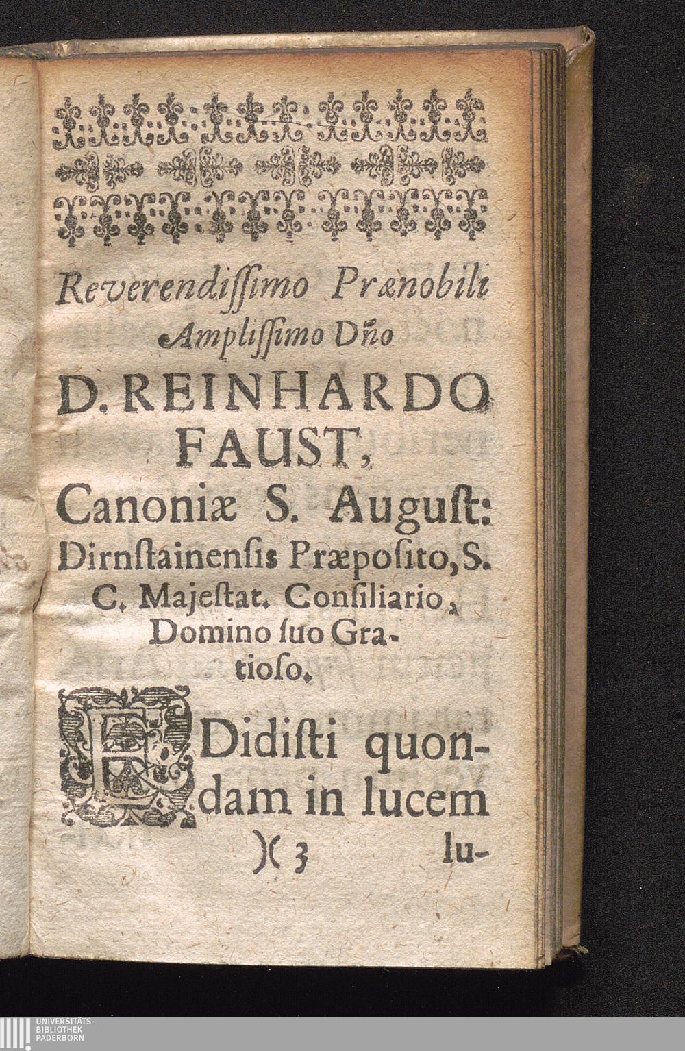 Reverendissimo Prænobili Amplissimo D[omi]no D. Reinhardo Faust, Canoniæ S. August:[...]
