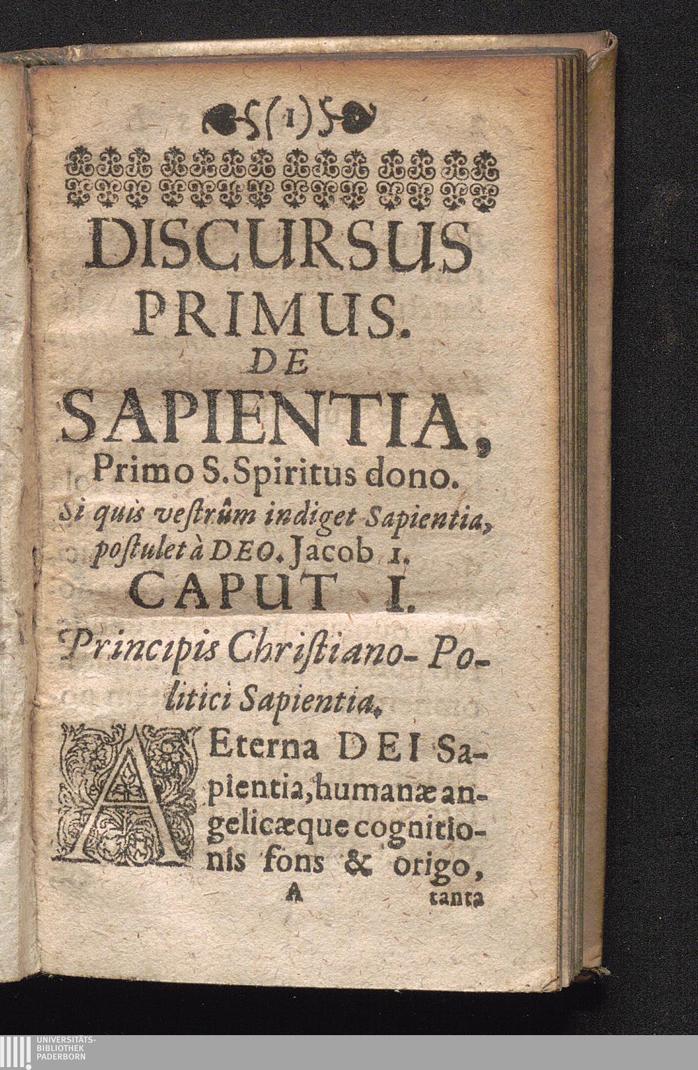 Discursus Primus. De Sapientia, Primo S. Spiritus dono. Si quis vestrûm indiget Sapientia,[...]