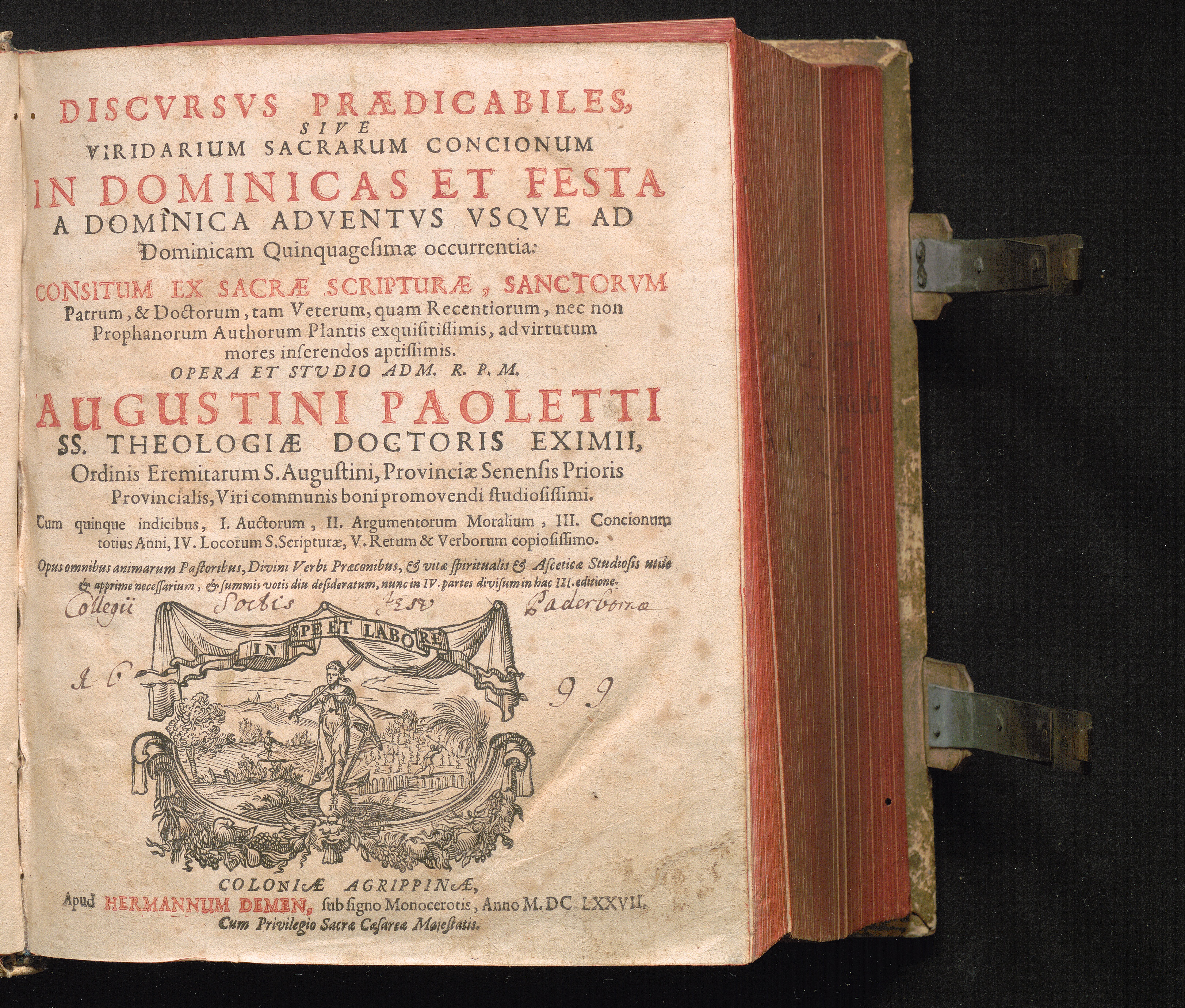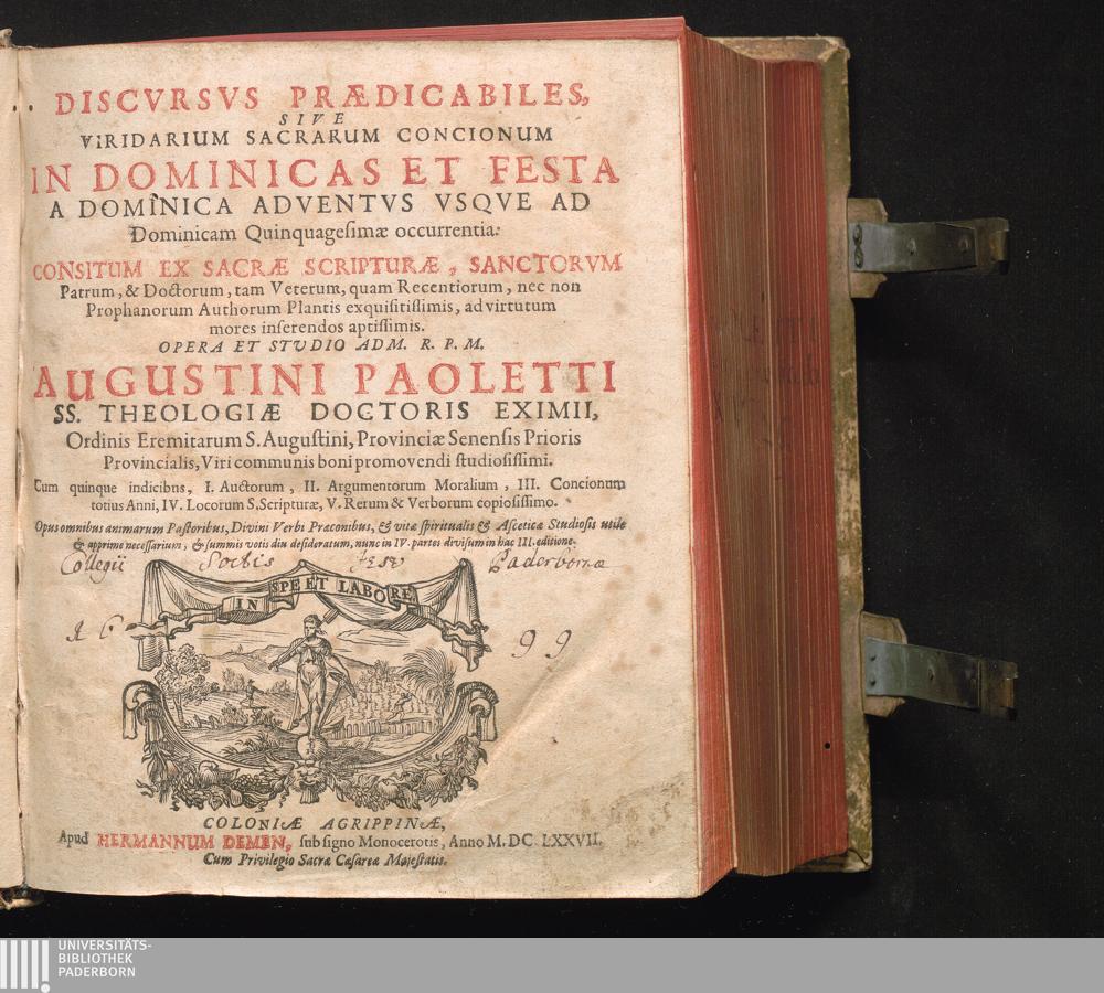 Discvrsvs Prædicabiles : Sive Viridarium Sacrarum Concionum In Dominicas Et Festa A Dominica Adventvs Vsqve Ad Dominicam Quinquagesimæ Occurentia: Consitum Ex Sacræ Scripturæ, Sanctorvm Patrum, Doctorum, tam Veterum, quam Recentiorum, nec non Prphanorum Authorum Plantis exquisitissimis, ad virtutum mores inferendos aptissimis ... Cum quinque indicibus, I. Auctorum, II. Argumentorum Moralium, III. Concionum totius Anni, IV. Locorum S. Scripturæ, V. Rerum & Verborum copiosissimo ... / Opera Et Studio ADM. R.P.M. Augustini Paoletti SS. Theologiæ Doctoris Eximii, Ordinis Eremitarum S. Augustini, Provinciæ Senensis Prioris Provincialis, Viri communis boni promovendi studiosissimi