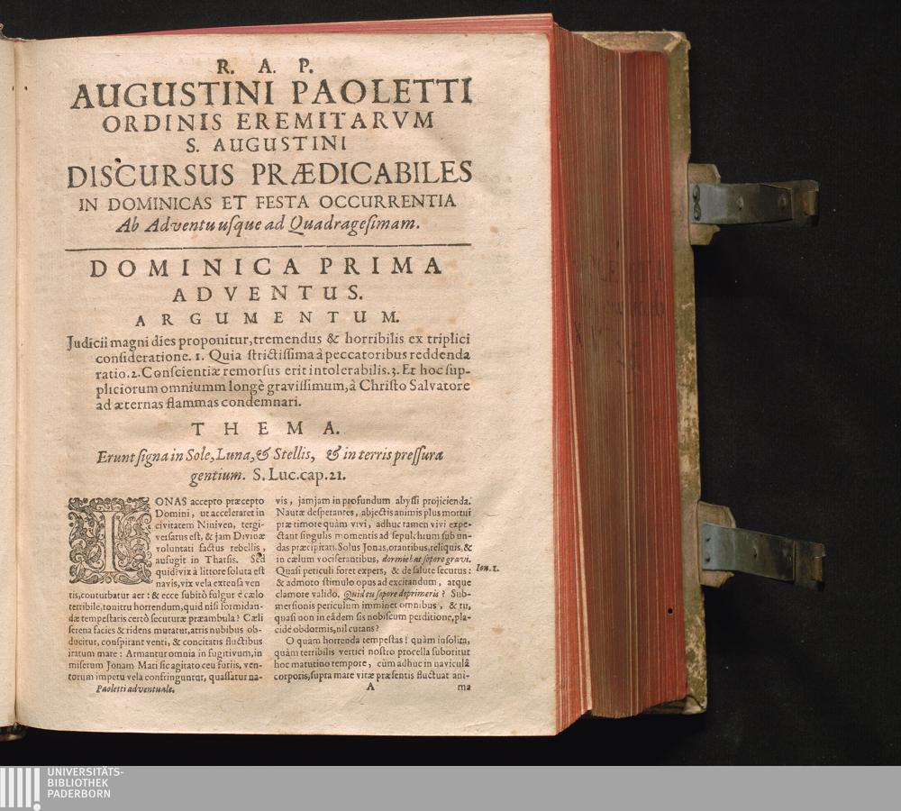 Discvrsvs Prædicabiles : Sive Viridarium Sacrarum Concionum In Dominicas Et Festa A Dominica Adventvs Vsqve Ad Dominicam Quinquagesimæ Occurentia: Consitum Ex Sacræ Scripturæ, Sanctorvm Patrum, Doctorum, tam Veterum, quam Recentiorum, nec non Prphanorum Authorum Plantis exquisitissimis, ad virtutum mores inferendos aptissimis ... Cum quinque indicibus, I. Auctorum, II. Argumentorum Moralium, III. Concionum totius Anni, IV. Locorum S. Scripturæ, V. Rerum & Verborum copiosissimo ... / Opera Et Studio ADM. R.P.M. Augustini Paoletti SS. Theologiæ Doctoris Eximii, Ordinis Eremitarum S. Augustini, Provinciæ Senensis Prioris Provincialis, Viri communis boni promovendi studiosissimi