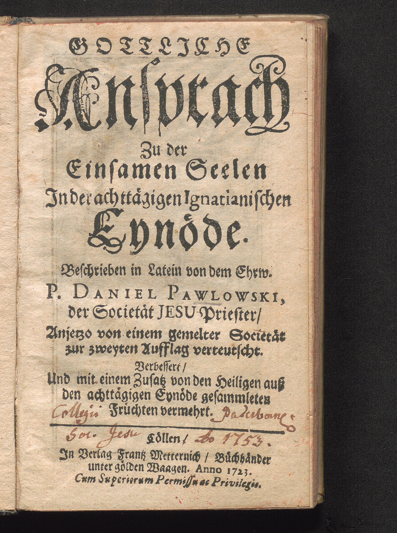 Gottliche Ansprach Zu der Einsamen Seelen Jn der achttägigen Ignatianischen Eynöde / Beschrieben in Latein von dem Ehrw. P. Daniel Pawlowski, der Societät Jesu Priester