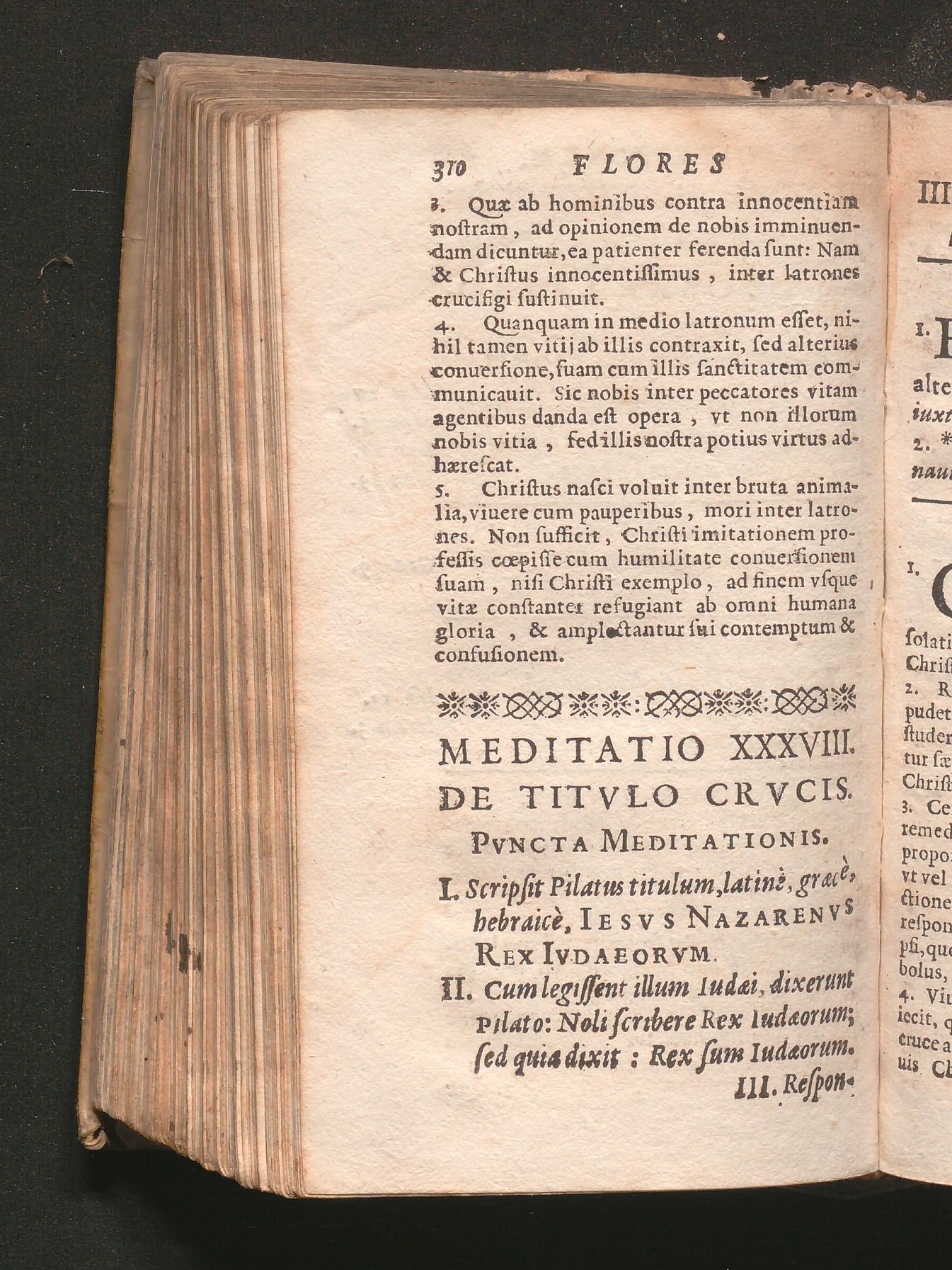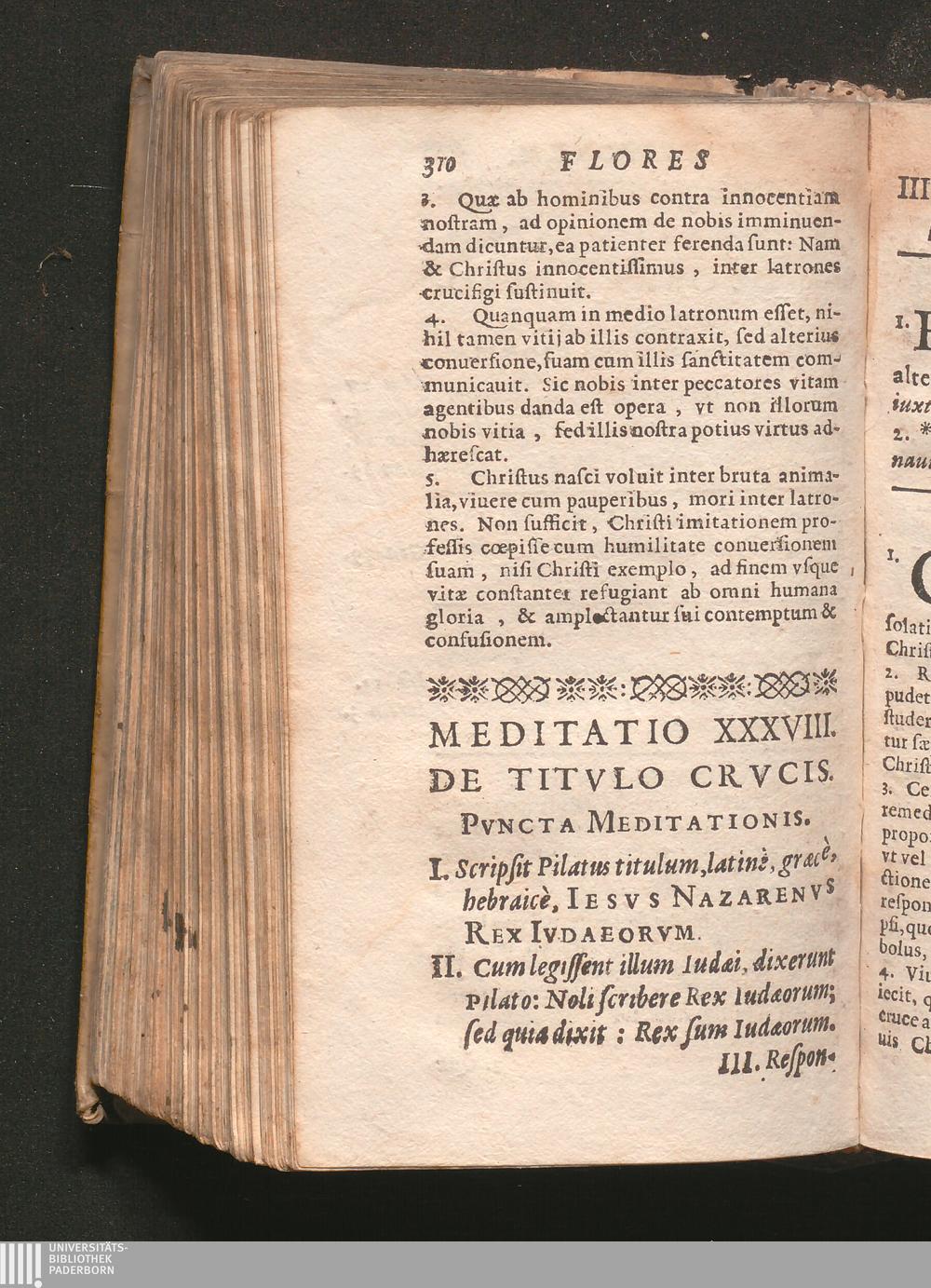 Flores Meditationvm : Ex S. Ignatio, Vincentio Bruno, Ioanne Busaeo, Aliisq[ue] Soc. Iesv PP.bus Decerpti, In quibus continentur Meditationes ; I. De pleris[que] mysteriis vitae Christi. II. De sacratißima eius Paßione. III. De omnibus Dominicis totius anni. IV. De præcipuis festis Sanctorum ... / [Philippus Bebius]
