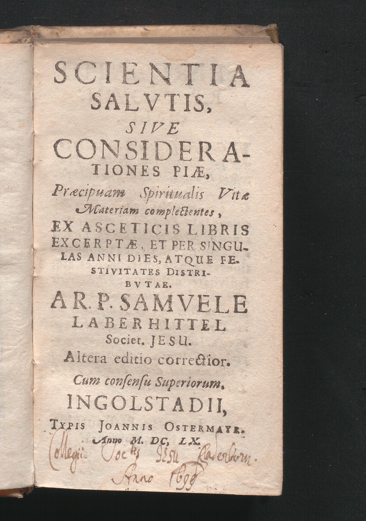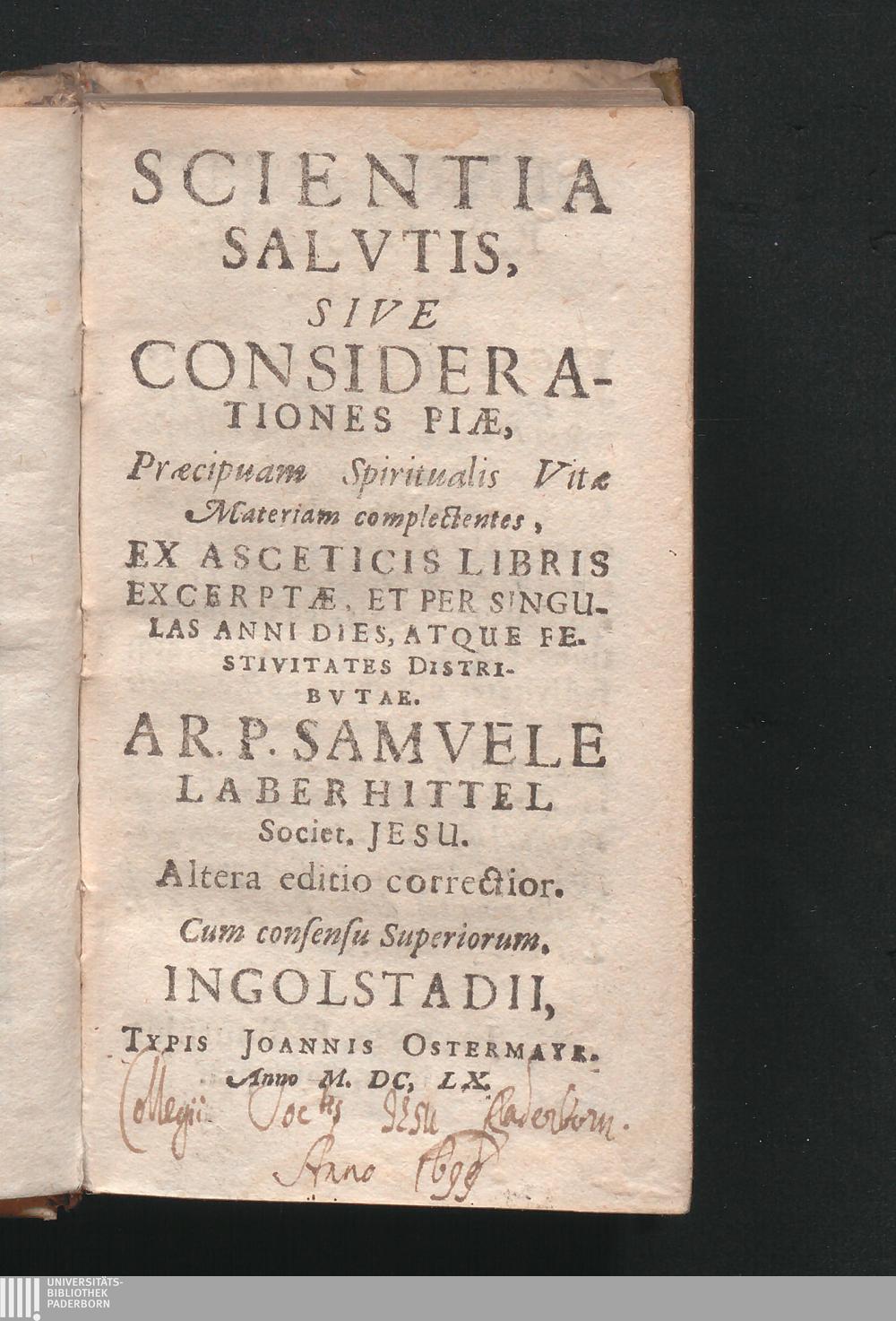 Scientia Salvtis, Sive Considerationes Piæ, Præcipuam Spiritualis Vitæ Materiam complectens : Ex Asceticis Libris Excerptæ, Et Per Singulas Anni Dies, Atque Festivitates Distribvtae / A R. P. Samvele Laberhittel Societ. Jesu