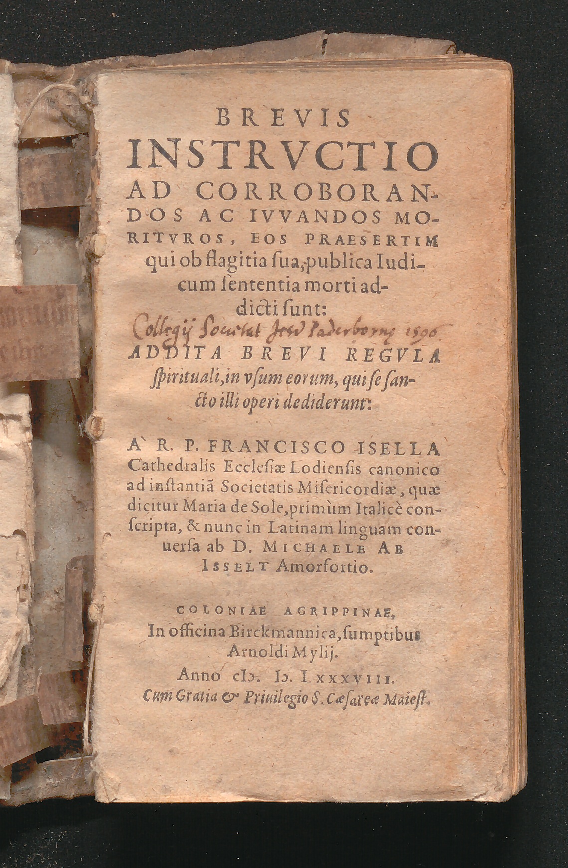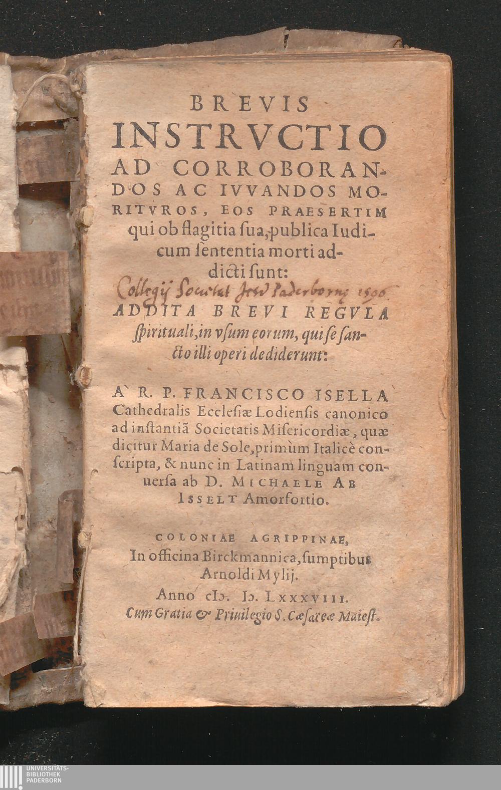 BREVIS|| INSTRVCTIO|| AD CORROBORAN-||DOS AC IVVANDOS MO-||RITVROS, EOS PRAESERTIM|| qui ob flagitia sua, publica Iudi-||cum sententia morti ad-||dicti sunt:|| : Addita Brevi Regvla spirituali, in vsum eorum, qui se sancto illi operi dediderunt / A R.P. Francisco Isella Cathedralis Ecclesiae Lodiensis canonico ad instantia[m] Societatis Misericordiæ. Primum Italicè conscripta, & nunc in Latinam linguam conuersa ab D. Michaele Ab Isselt Amorfortio