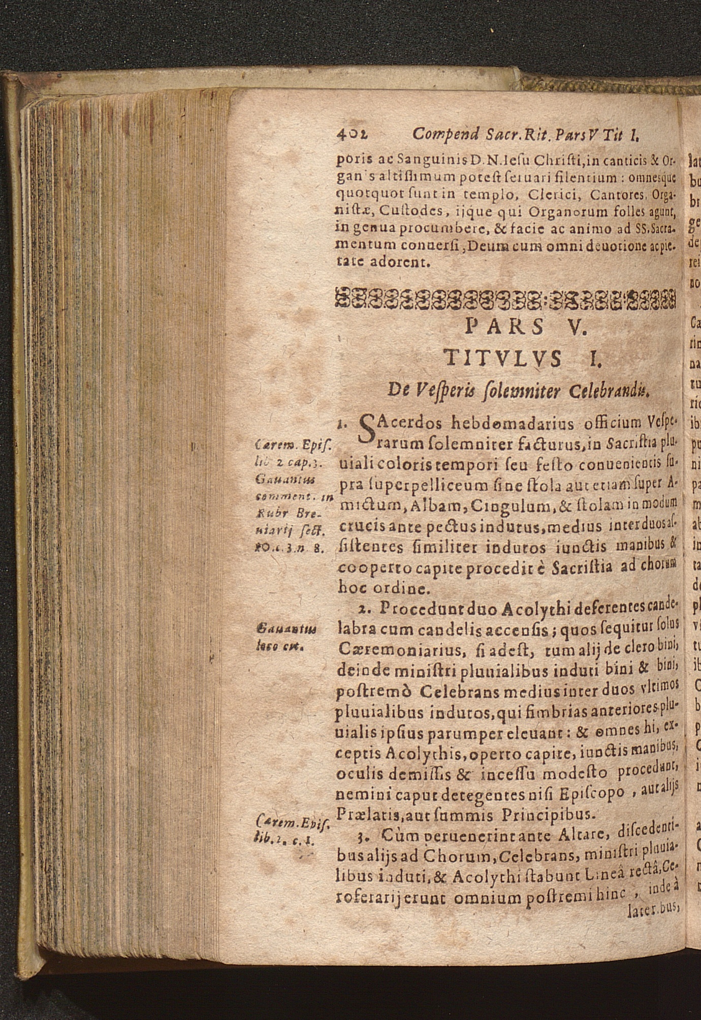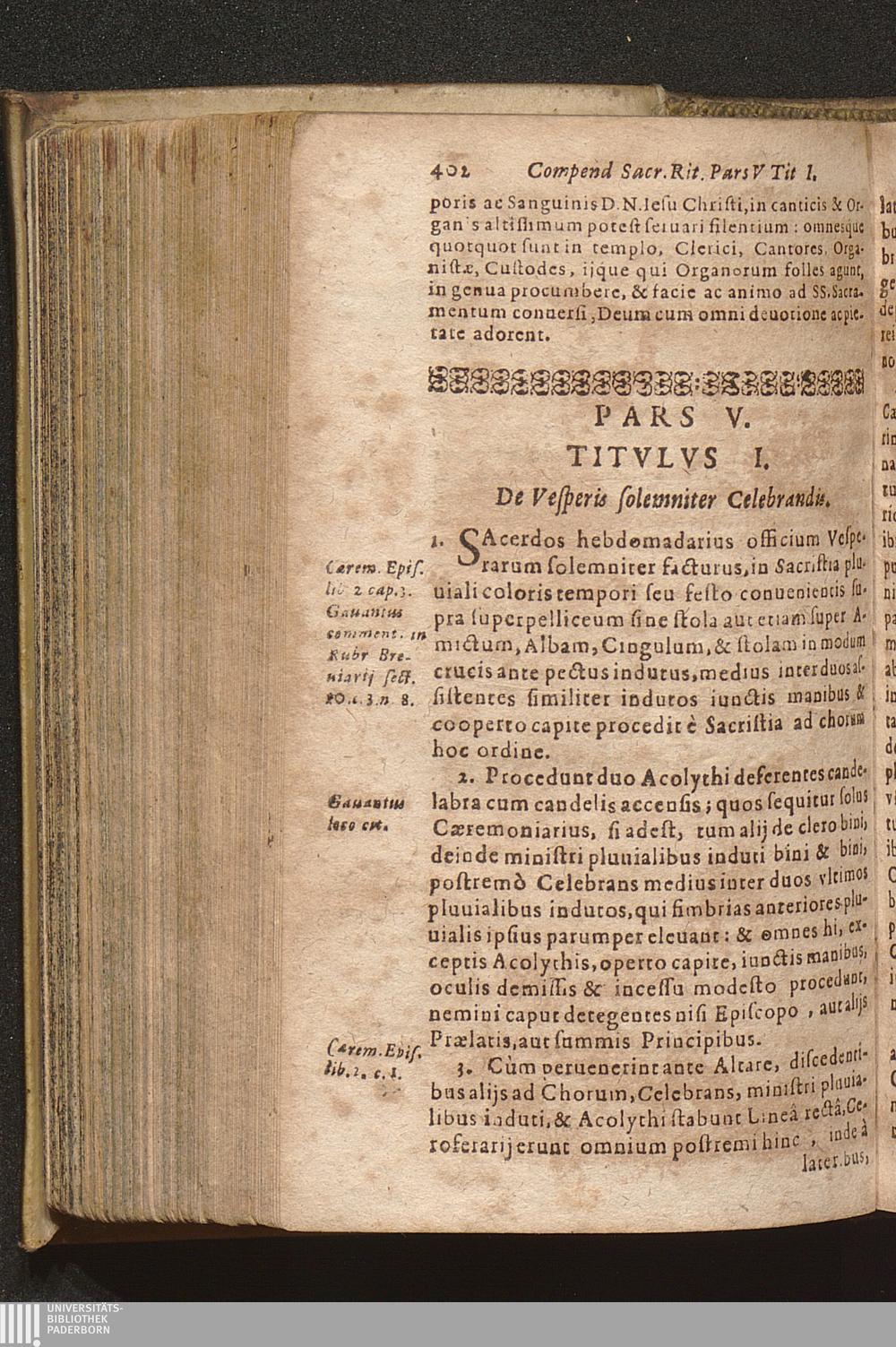 Compendium Sacrorvm Ritvvm Et Caeremoniarvm : Quae In Missis Qua Privatis, Qva Solennibus, Nec Non Pontificialibus, Et quibuscunque alijs Ecclesiasticis functionibus, ex Rubricarum Missalis Romani, Caeremonialis Episcoporum praescripto, Bartholomaei Gavanti, aliorumque probatissimorum Auctorum expositione seruari debent. Omnibvs Cvivscvmqve Ordinis Et gradus Ecclesiasticis personis non minùs vtile quàm necessarium. / Operâ & studio R. D. Gerlaci Vinitoris Basilicae S. Vrsulae Coloniensis Vicarij
