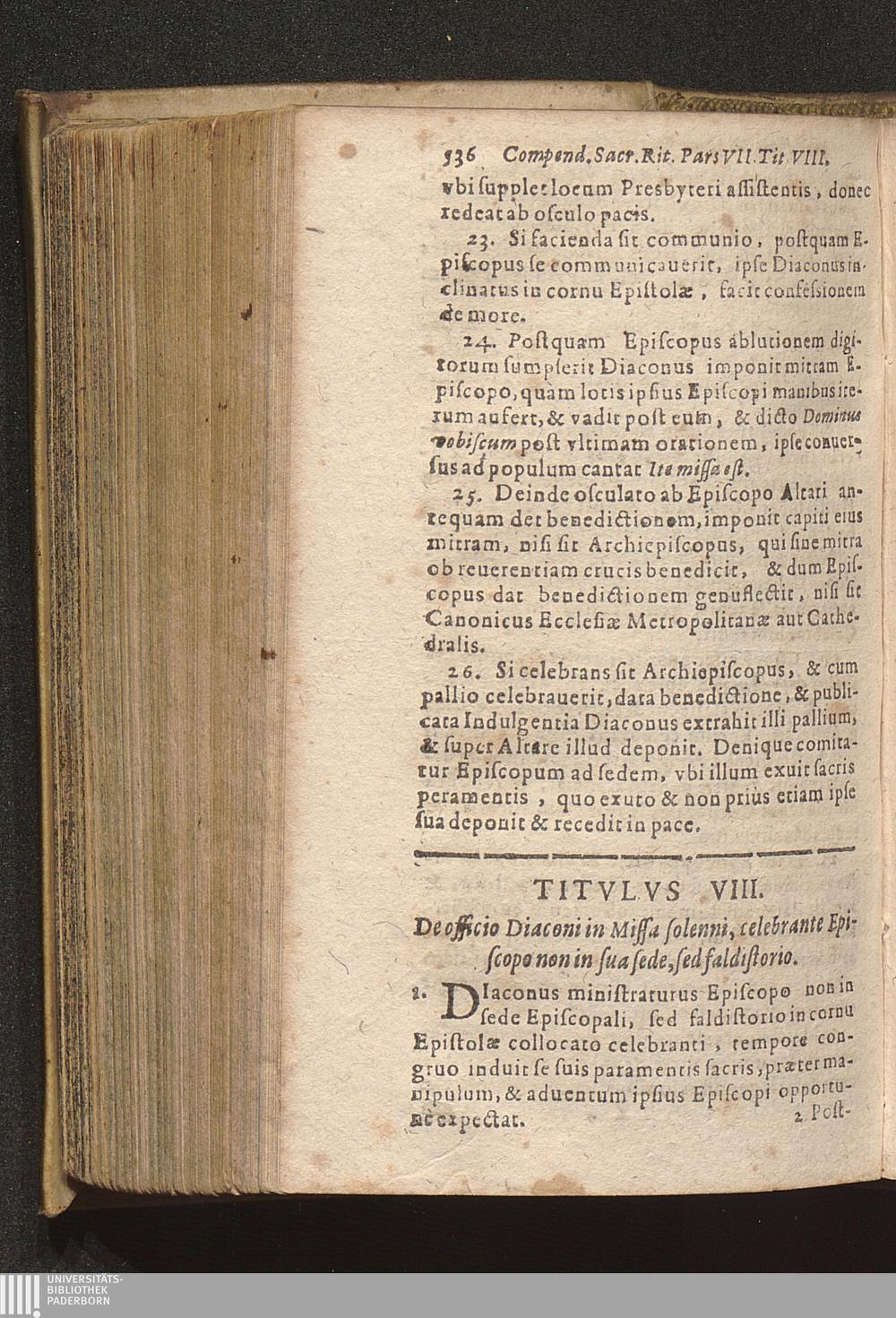 Compendium Sacrorvm Ritvvm Et Caeremoniarvm : Quae In Missis Qua Privatis, Qva Solennibus, Nec Non Pontificialibus, Et quibuscunque alijs Ecclesiasticis functionibus, ex Rubricarum Missalis Romani, Caeremonialis Episcoporum praescripto, Bartholomaei Gavanti, aliorumque probatissimorum Auctorum expositione seruari debent. Omnibvs Cvivscvmqve Ordinis Et gradus Ecclesiasticis personis non minùs vtile quàm necessarium. / Operâ & studio R. D. Gerlaci Vinitoris Basilicae S. Vrsulae Coloniensis Vicarij