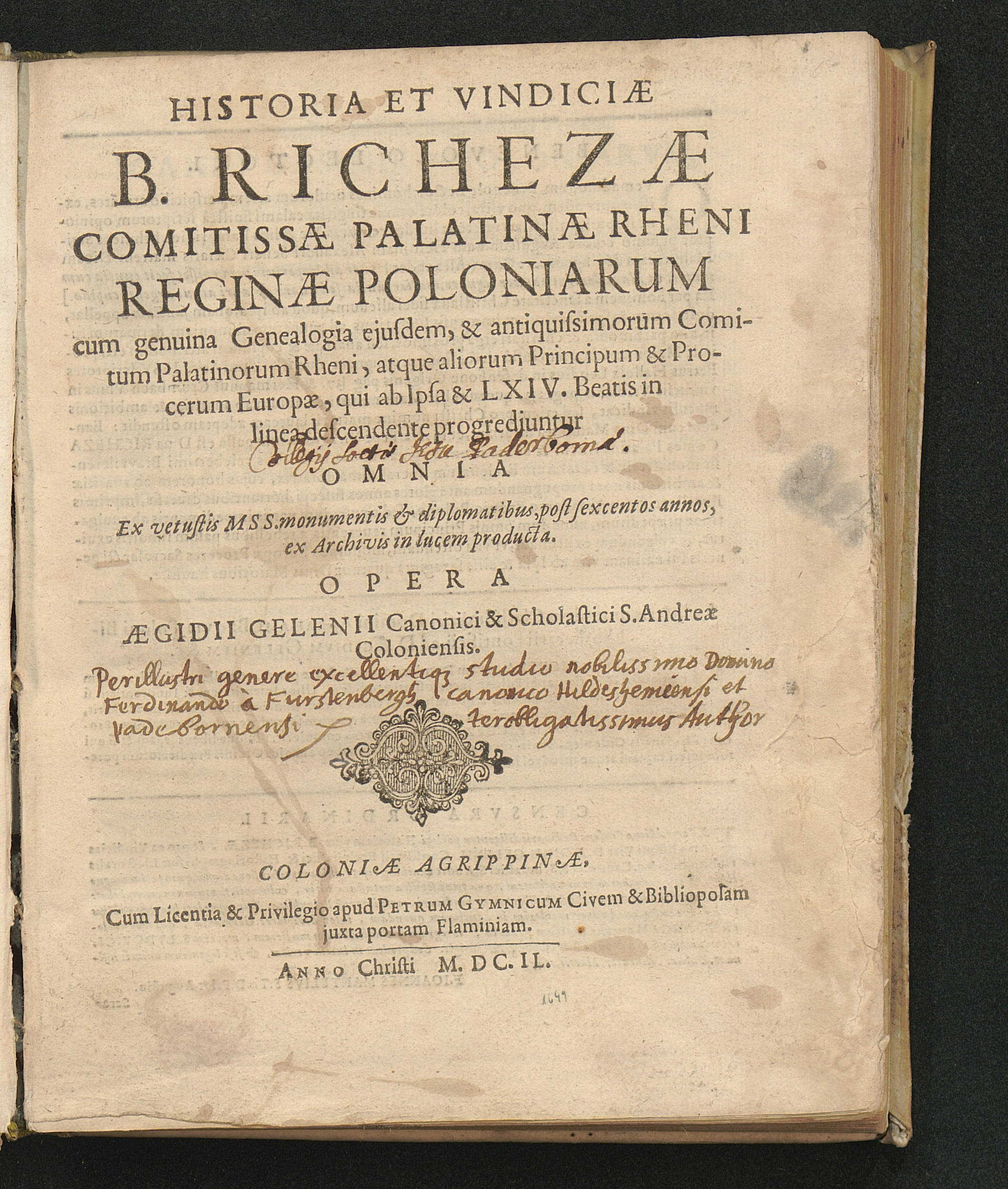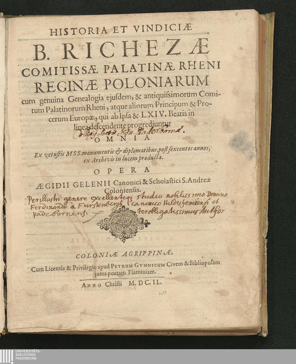 Historia Et Vindiciae B. Richezae Comitissae Palatinae Rheni Reginae Poloniarum : cum genuina Genealogia ejusdem, & antiquissimorum Comitum Palatinorum Rheni, atque aliorum Principum & Procerum Europae, qui ab Ipsa & LXIV. Beatis in linea descendente progrediuntur ; Omnia Ex vetustis Mss. monumentis & diplomatibus, post sexcentos annos, ex Archivis in lucem producta / Opera Aegidii Gelenii Canonici & Scholastici S. Andreae Coloniensis