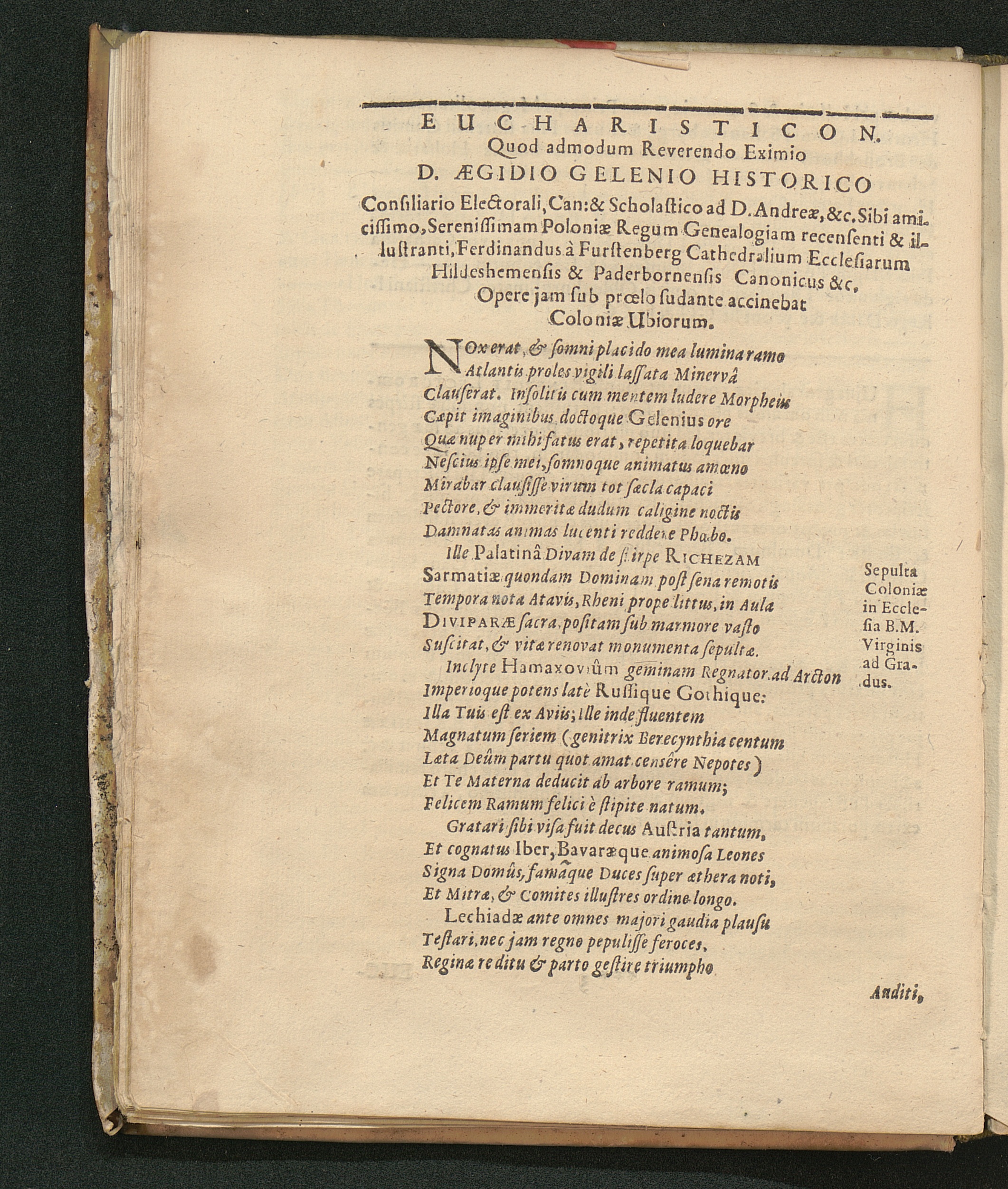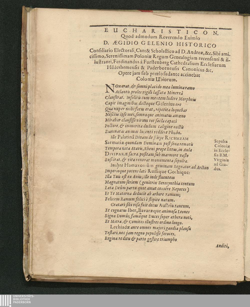 Historia Et Vindiciae B. Richezae Comitissae Palatinae Rheni Reginae Poloniarum : cum genuina Genealogia ejusdem, & antiquissimorum Comitum Palatinorum Rheni, atque aliorum Principum & Procerum Europae, qui ab Ipsa & LXIV. Beatis in linea descendente progrediuntur ; Omnia Ex vetustis Mss. monumentis & diplomatibus, post sexcentos annos, ex Archivis in lucem producta / Opera Aegidii Gelenii Canonici & Scholastici S. Andreae Coloniensis