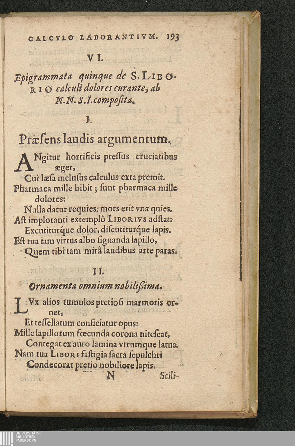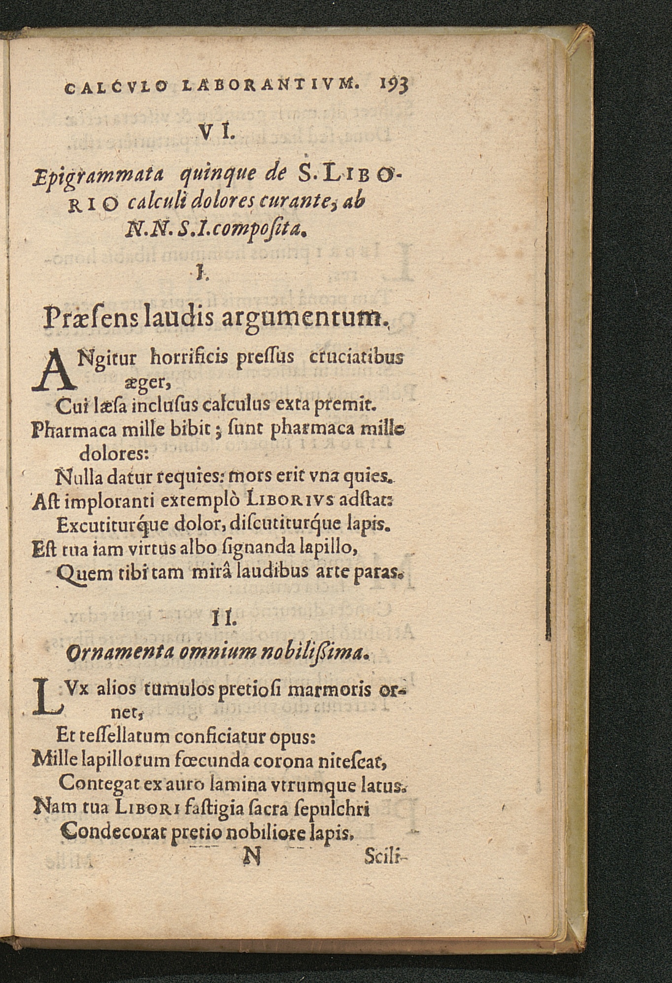 VI. Epigrammata quinque de S. Liborio calculi dolores curante, ab N.N.S.I. compo[...]