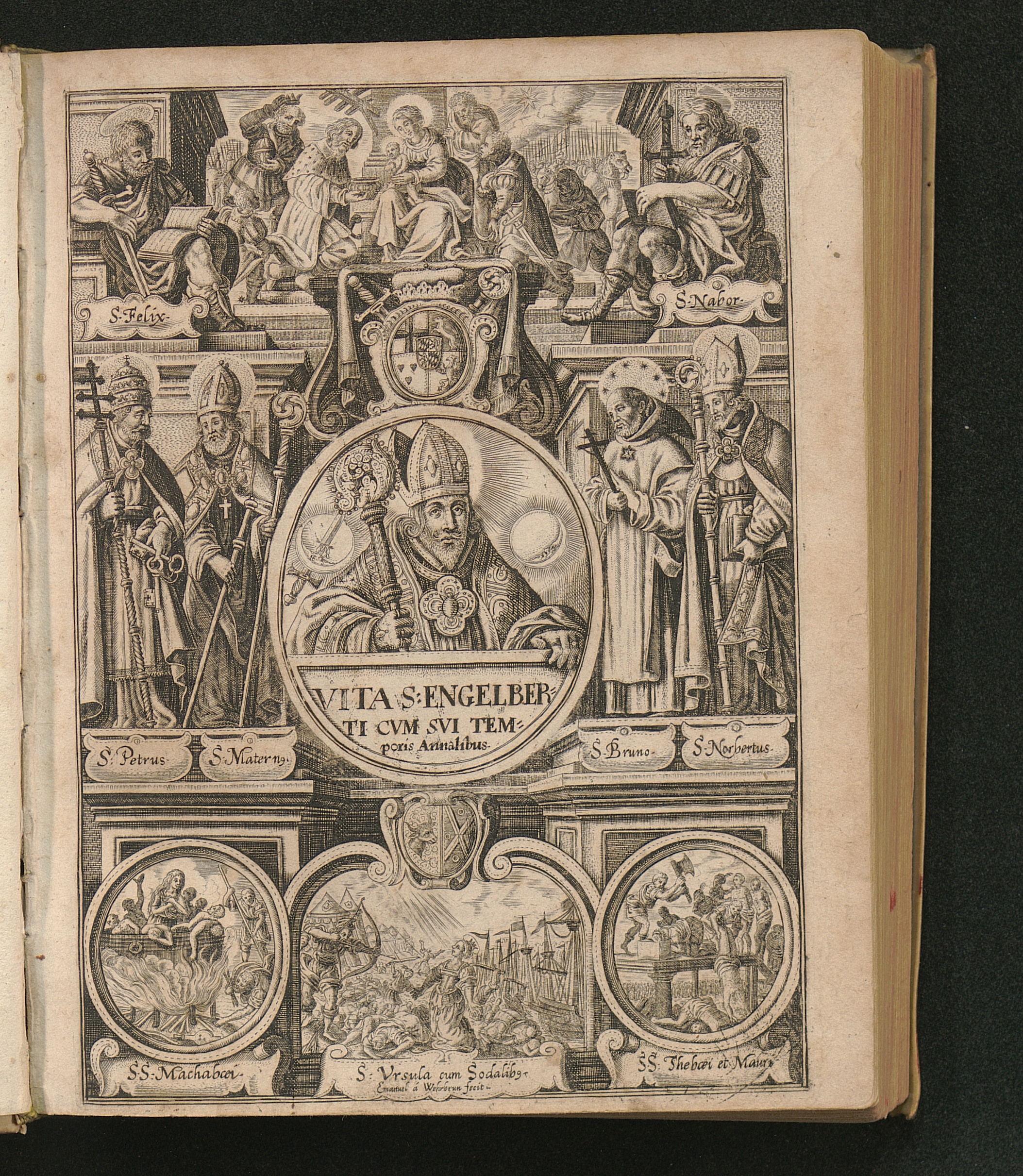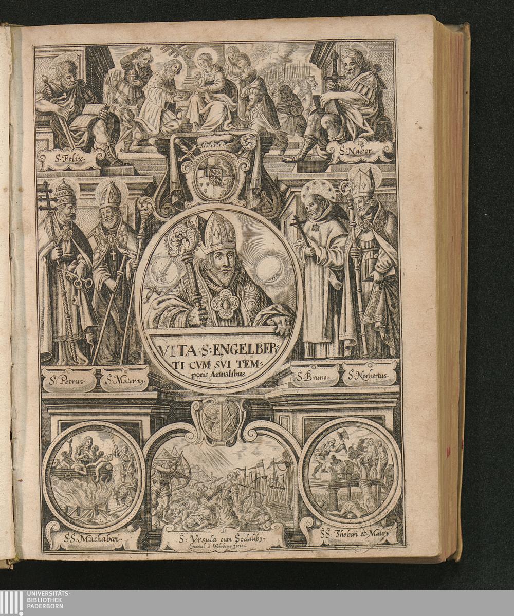 Vindex Libertatis Ecclesiasticae || Et Martyr || S. Engelbertvs || Archiepiscopvs Co-||loniensis Princeps || Elector, &c. : Vna Cvm Brevi Svae Aetatis Annalivm, Nobilivm Familiarvm, Et Monvmentorvm Agrippinensivm Ex Archivis Depromptorum editione / Per R. D. Aegidivm Gelenivm Licentiatum & S. Andreae Canonicum
