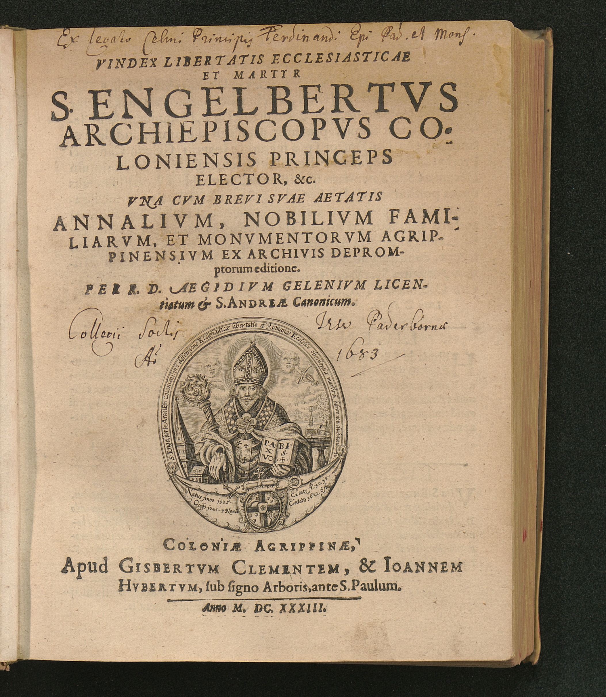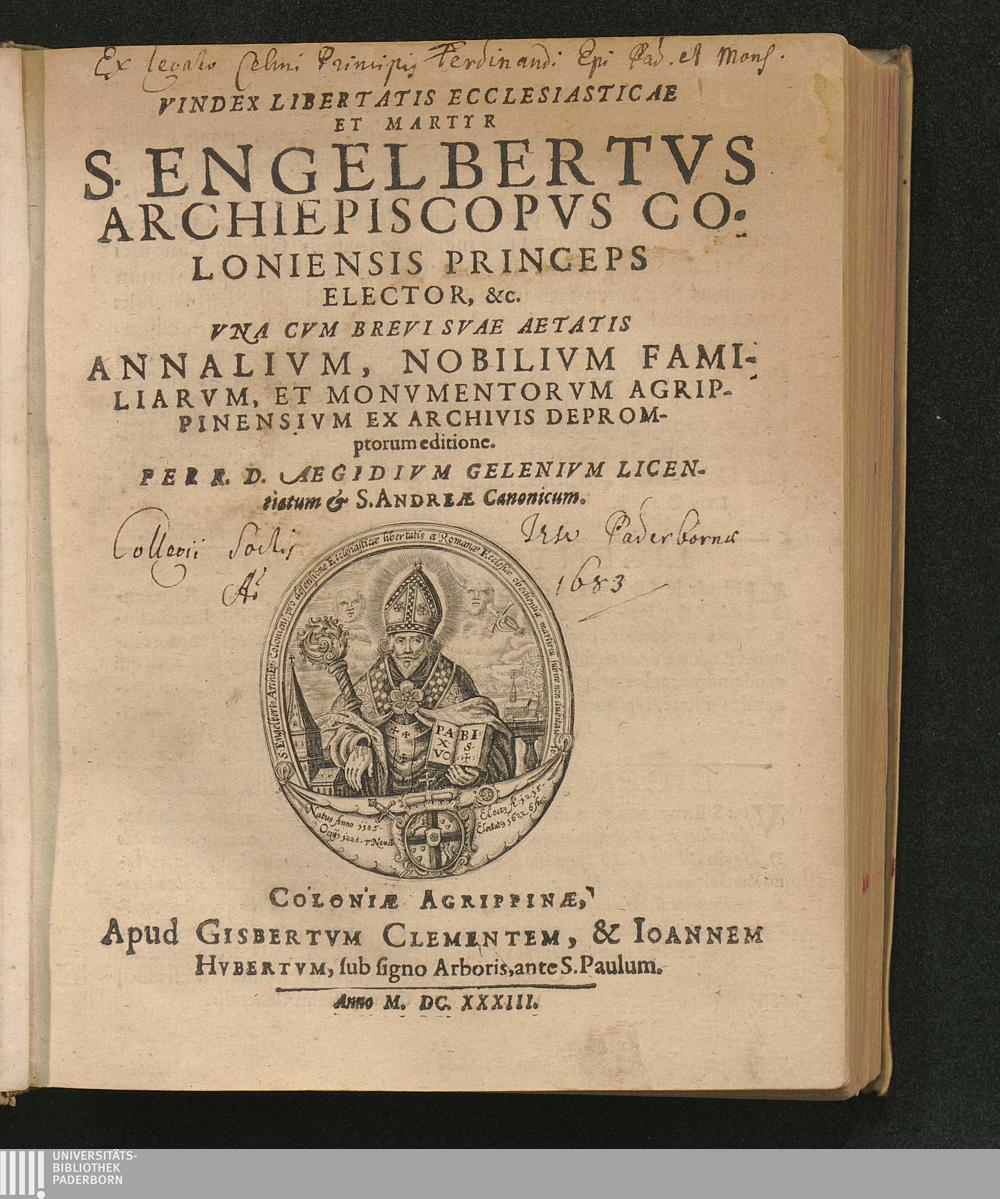 Vindex Libertatis Ecclesiasticae || Et Martyr || S. Engelbertvs || Archiepiscopvs Co-||loniensis Princeps || Elector, &c. : Vna Cvm Brevi Svae Aetatis Annalivm, Nobilivm Familiarvm, Et Monvmentorvm Agrippinensivm Ex Archivis Depromptorum editione / Per R. D. Aegidivm Gelenivm Licentiatum & S. Andreae Canonicum