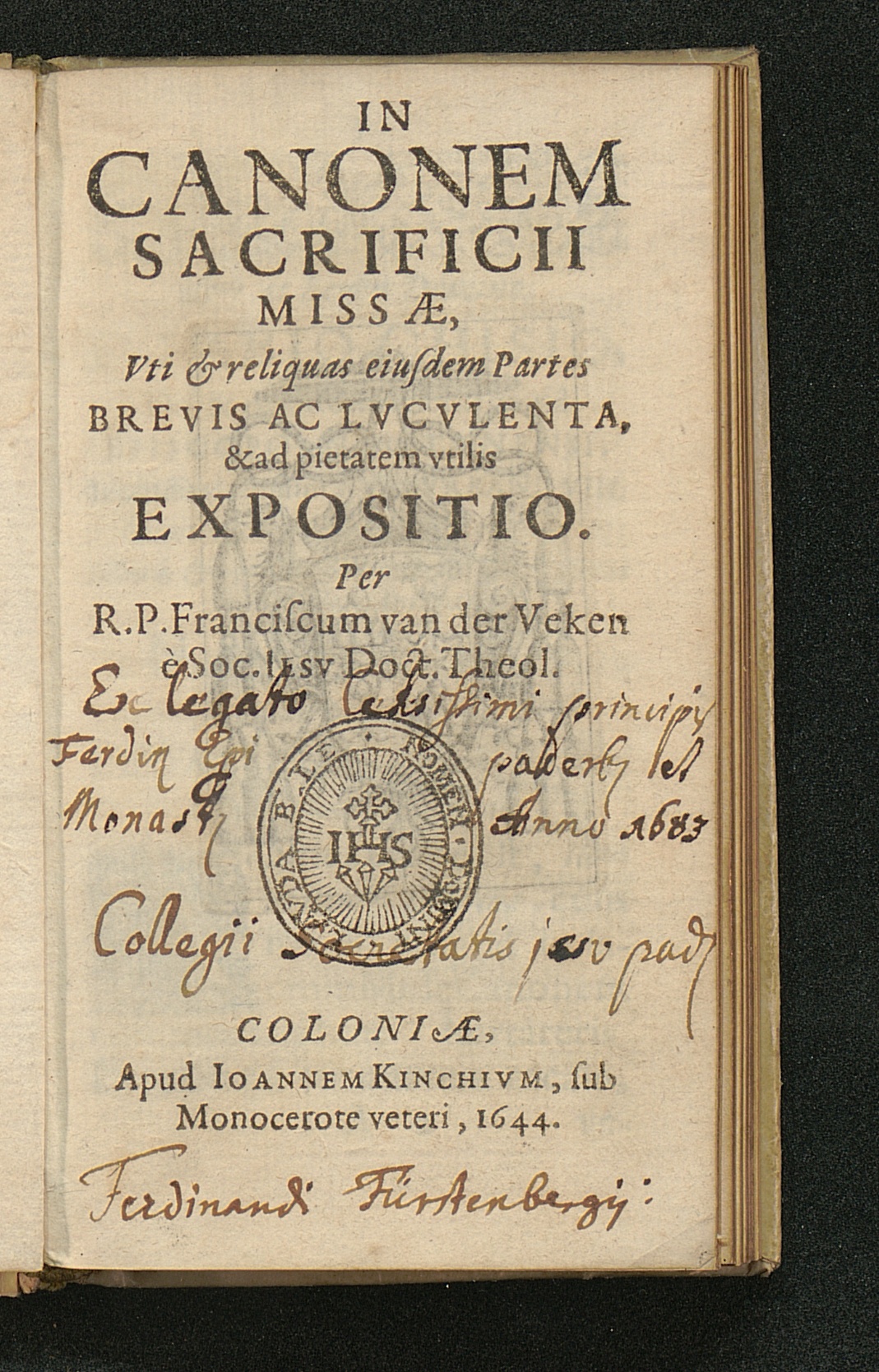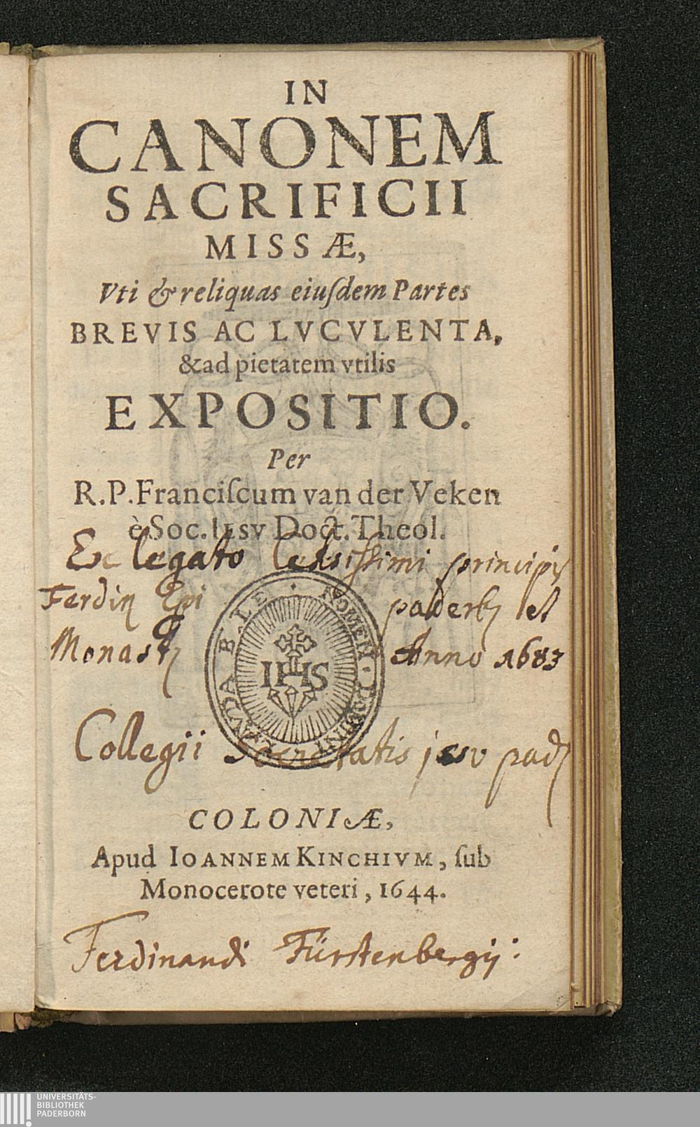 In Canonem Sacrificii Missae, Vti & reliquas eiusdem Partes Brevis Ac Lvcvlenta, & ad pietatem vtilis Expositio / Per R. P. Franciscum van der Veken è Soc. Iesv Doct. Theol.