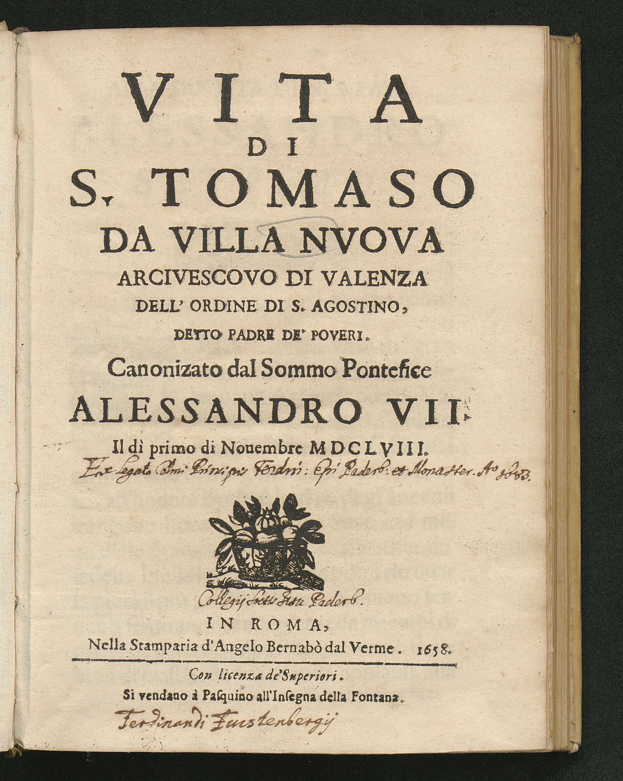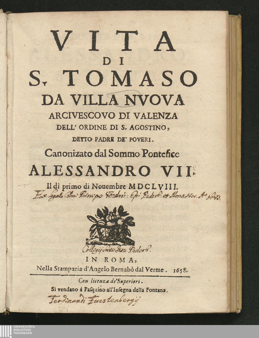 Vita Di S. Tomaso Da Villa Nvova Arcivescovo Di Valenza Dell'Ordine Di S. Agostino, Detto Padre De' Poveri : Canonizato dal Sommo Pontefice Alessandro VII. Il di primo di Nouembre MDCLVIII. / [Michele Salone]