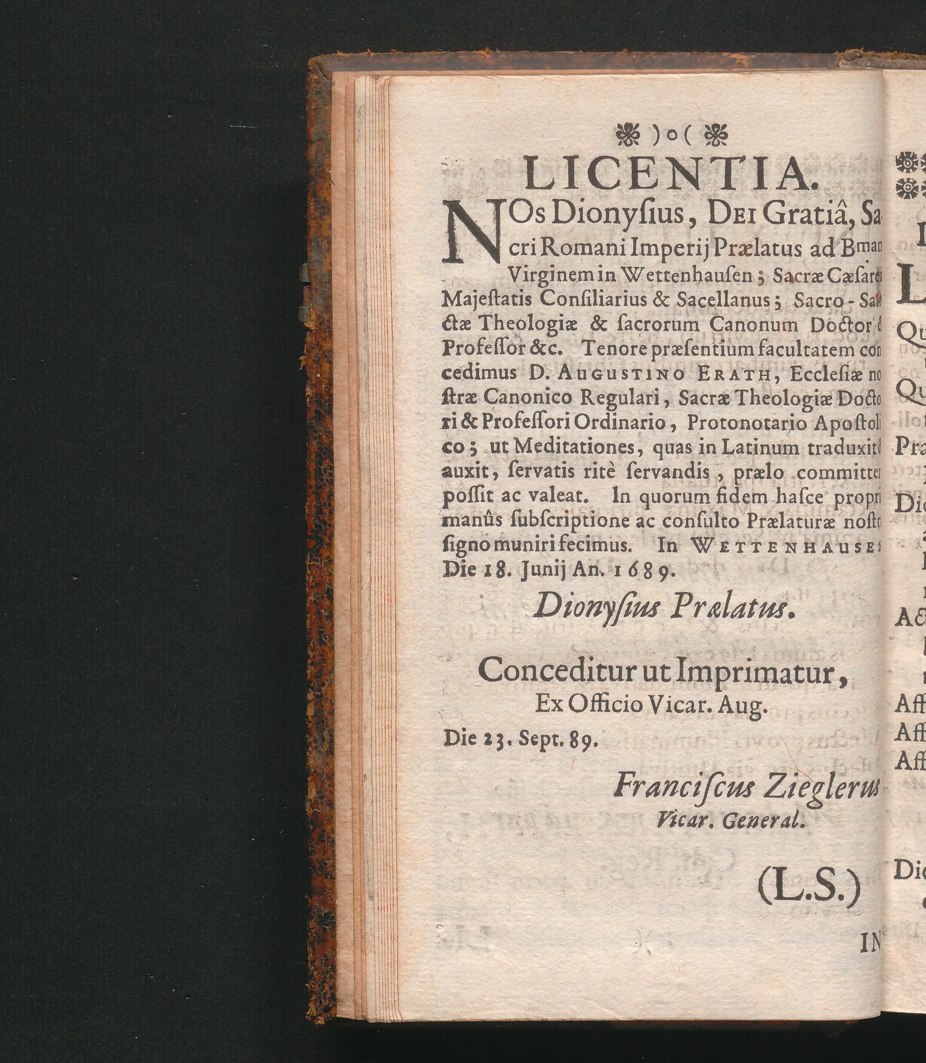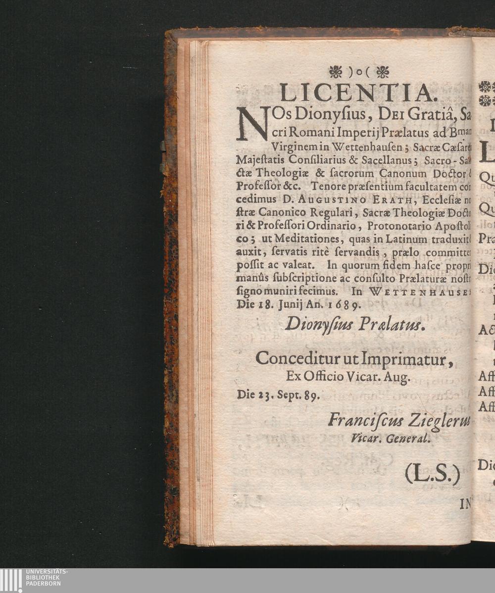 Meditationes Et Recollectiones Animæ, Per decendialia Exercitia Deo suo Vacaturæ : Opus Spirituale & Morale continens triginta Meditationes: X. Pro via purgativa, Illuminativa & unitiva. X. De vita & Statu Religioso. X. De Statu Clericali & Sacris Ordinibus / In subsidium animae devotae Italico Idiomate editum A R.D. Bernardo Finetti, Clerico Regulari Veneto. Nunc in Latinum traductum, & copiose auctum a R.D. Augustino Erath, ad B.V. in Wettenhausen Canon. Regul. ...