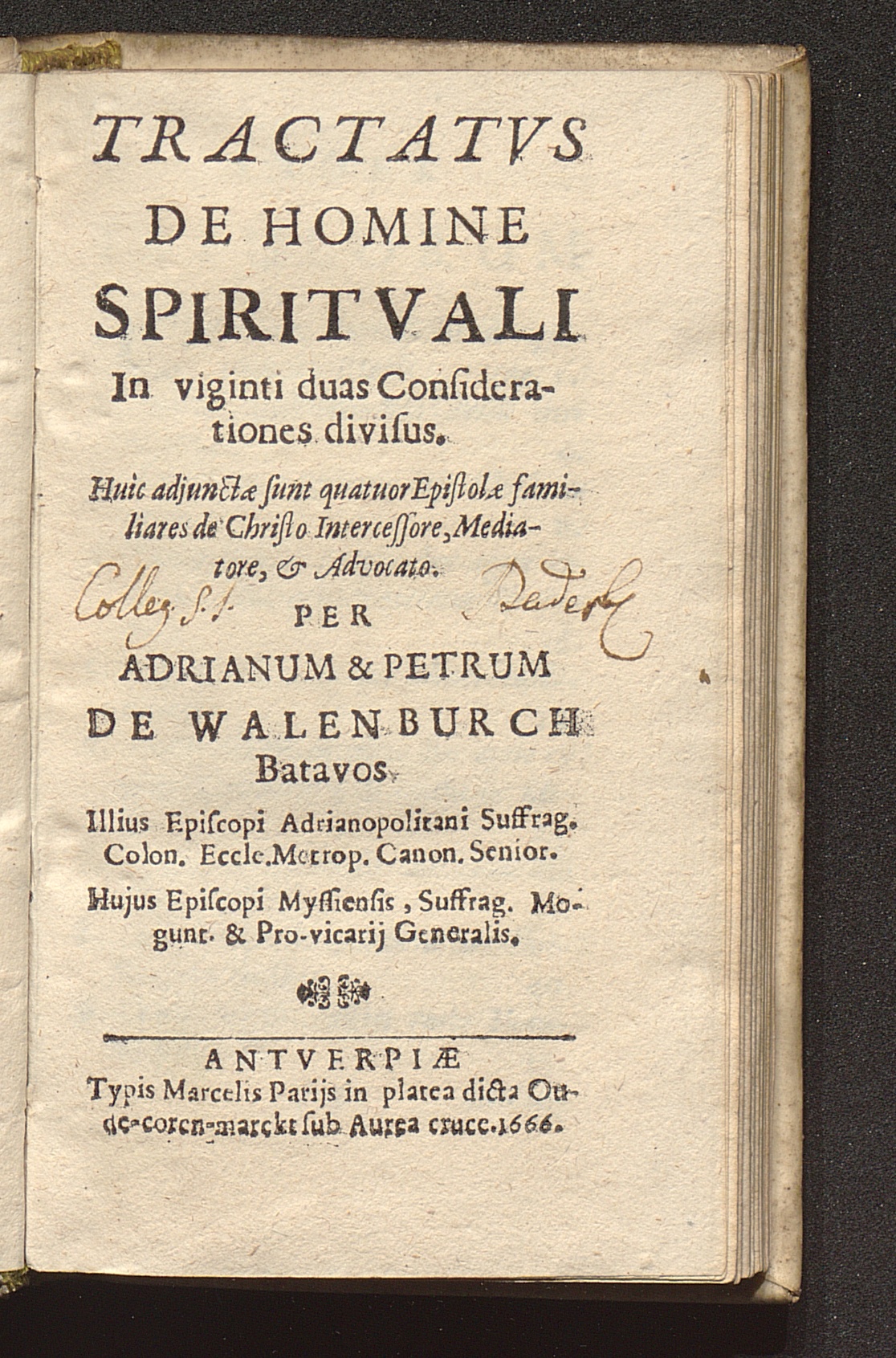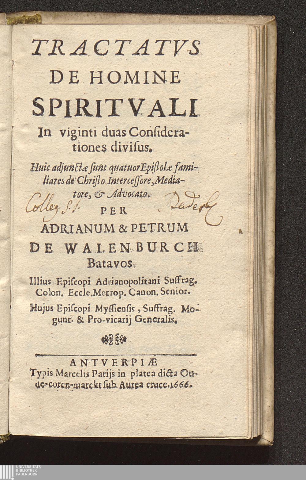 Tractatvs De Homine Spiritvali : In viginti duas Considerationes divisus / Per Adrianum & Petrum De Walenburch Batavos Illius Episcopi Adrianopolitani ... Hujus Episcopi Myssiensis ...
