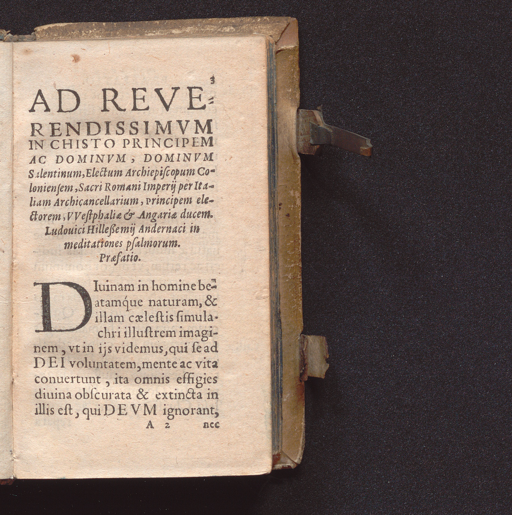 Ad Reverendissimvm In Christo Principem Ac Dominvm, Dominvm Salentinum, Electum Archiepiscoporum Coloniensem, Sacri Romani Imperij per Italiam Archicancellarium, principem electorem, VVestphaliæ & Angariæ ducem. Ludouici Hilleßemij Andernaci in meditationes psalmorum. Præfatio.