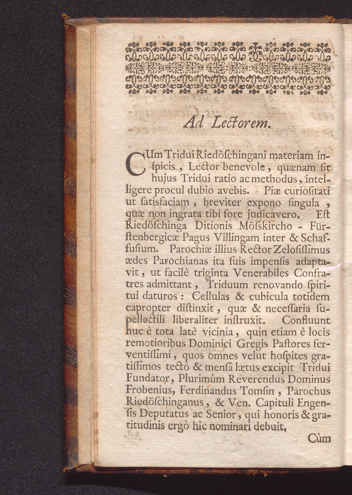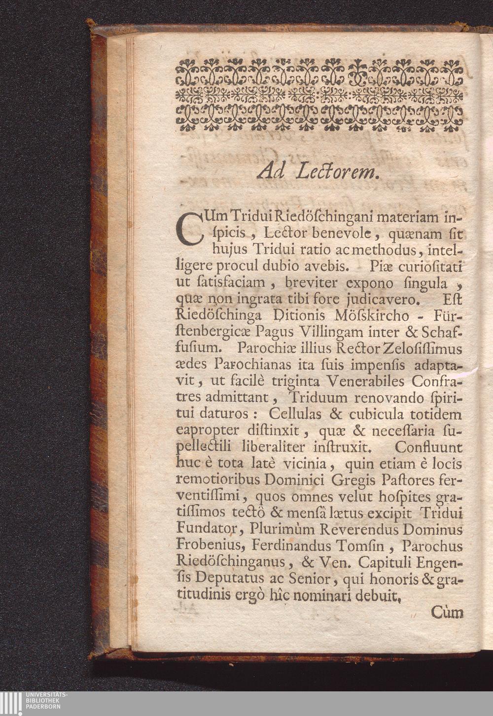 Sacerdos Aut Sanctus Aut Reprobus : Triduo Expensus Riedœschingæ In Secessu annuo Venerabilis Cleri Mense Junio MDCCXLII / Præside ac Directore P. Maximiliano Dufréne S. J. Serenissimo S. R. I. Principi Carolo Fürstenbergio à Sacratioribus Consiliis, & sacris Confessionibus
