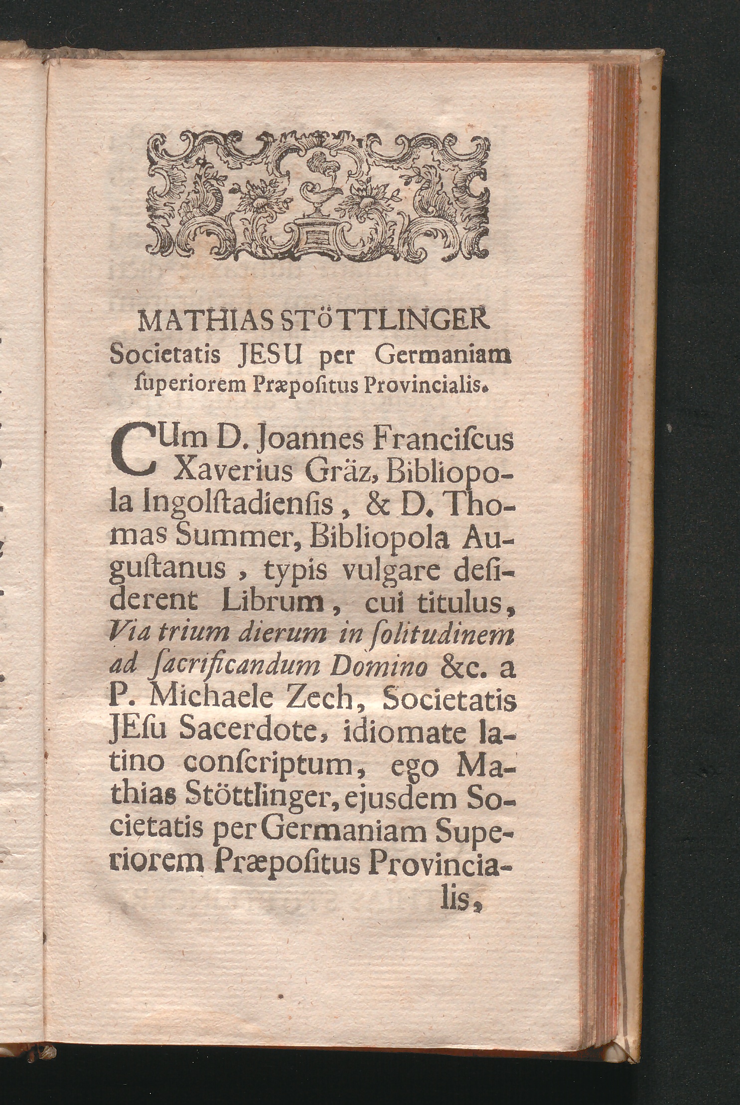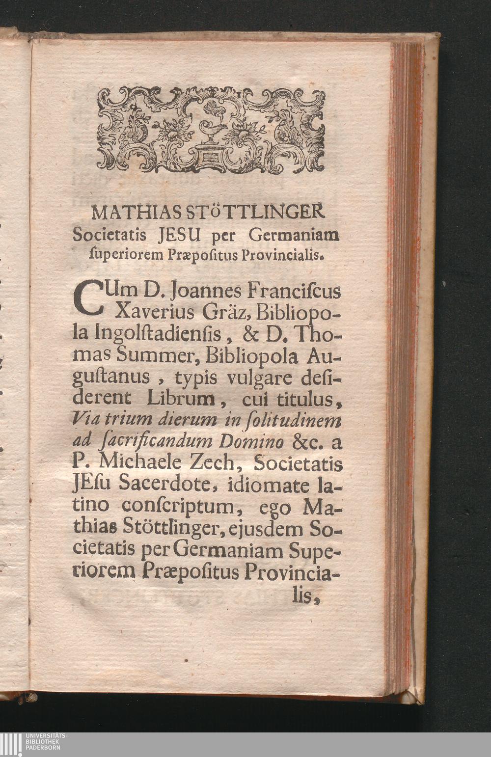 Via Trium Dierum In Solitudinem Ad Sacrificandum Domino Exod. 8. Seu Triduana Ven. Cleri Solitudo Et Animi Collectio Deo Sacra Duce S. P. Ignatio Loyola, Societatis Jesu Fundatore / Comite P. Michaele Zech Ejusdem Societatis Sacerdote