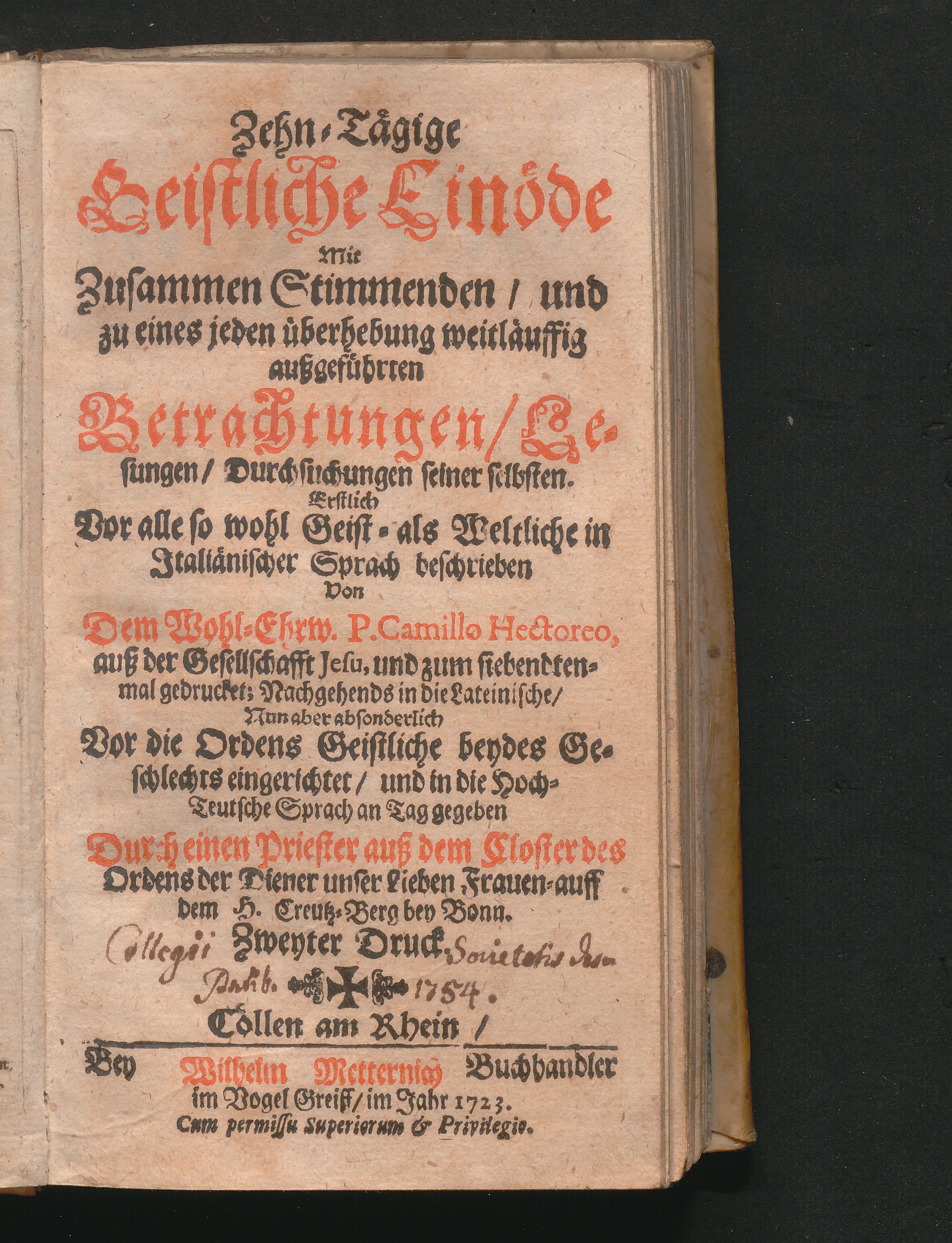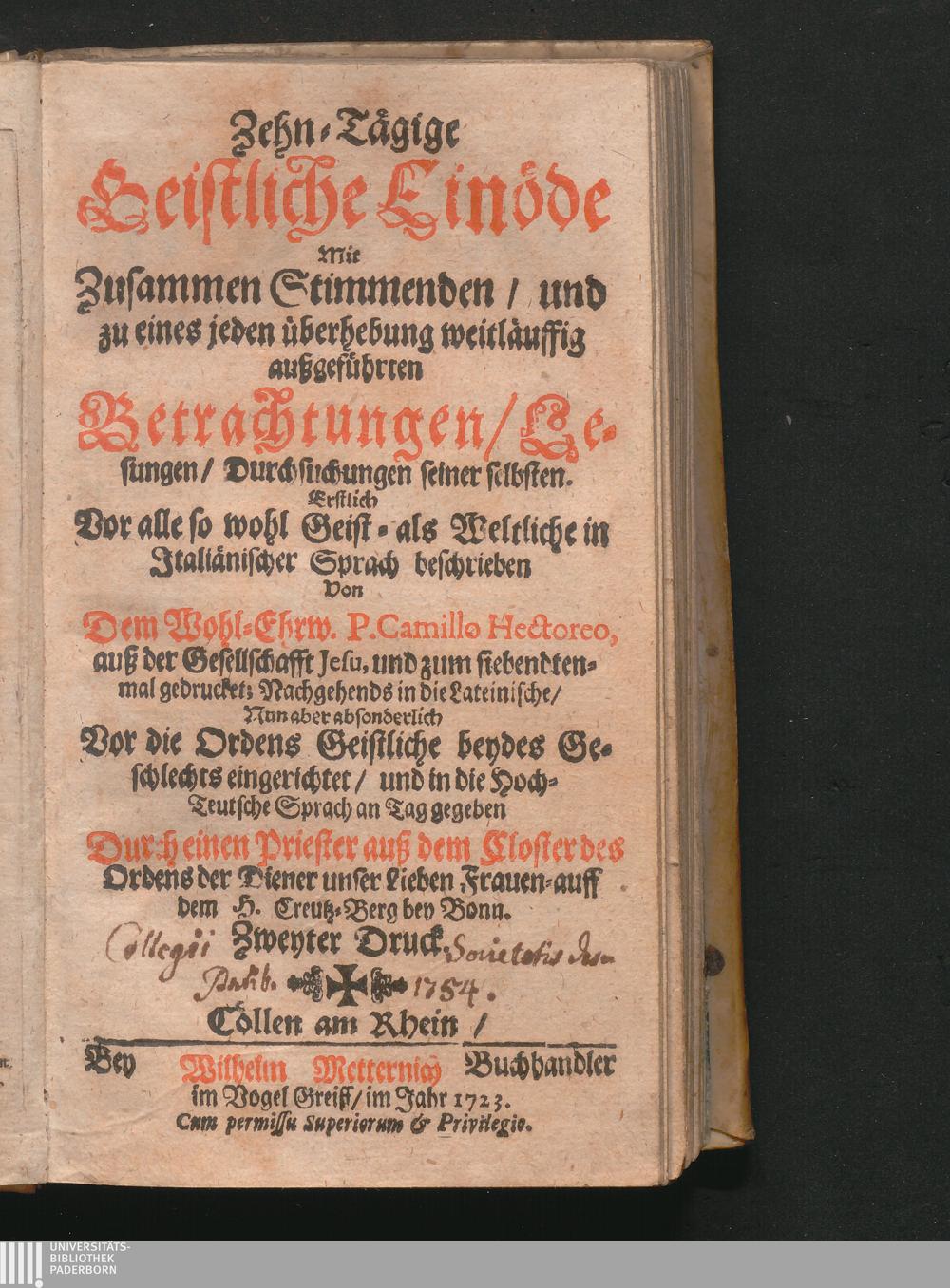 Zehn-Tägige Geistliche Einöde : Mit zusammen stimmenden, und zu eines jeden Uberhebung weitläuffig außgeführten Betrachtungen, Lesungen, und Durchsuchungen seiner selbsten / Erstlich Vor alle so wol Geist- als Weltliche in Italiänischer Sprach beschrieben, und schon zum Siebenten mal gedrucket; Nun aber absonderlich Vor die Ordens-Geistliche beydes Geschlechts eingerichtet, und zum Ersten mal, bevor zwar in Lateinischer, anjetzo auch in Teutscher Sprach an Tag gegeben. Durch einen Priester auß dem Closter des Ordens der Diener Unser Lieben Frauen auff dem H. Creutz-Berg bey Bonn [Camillo Ettori]