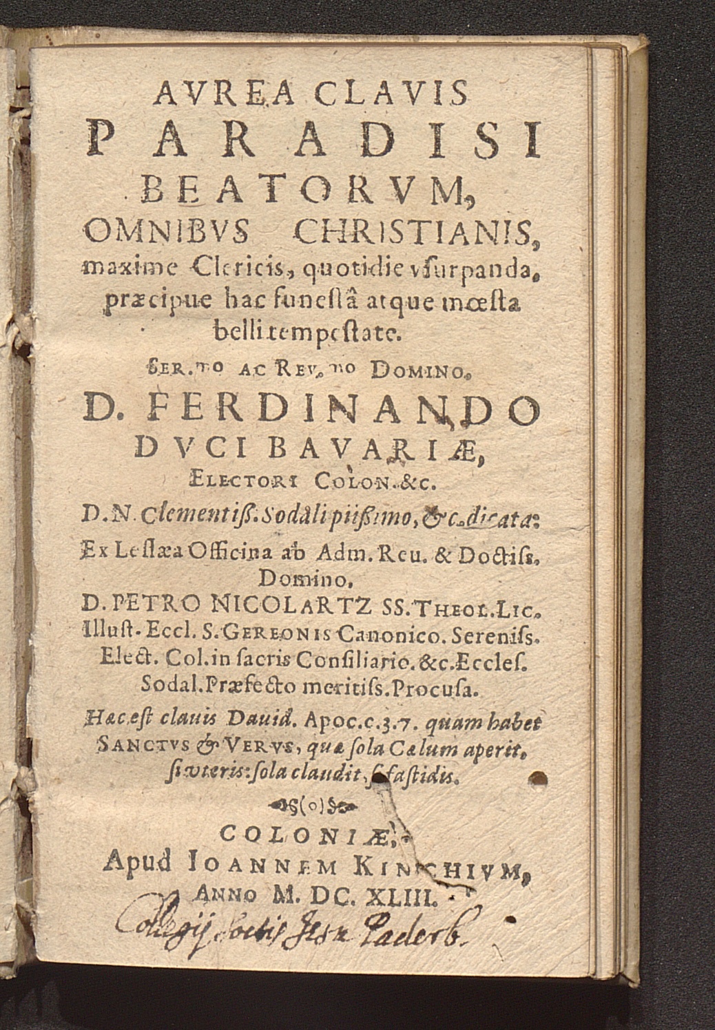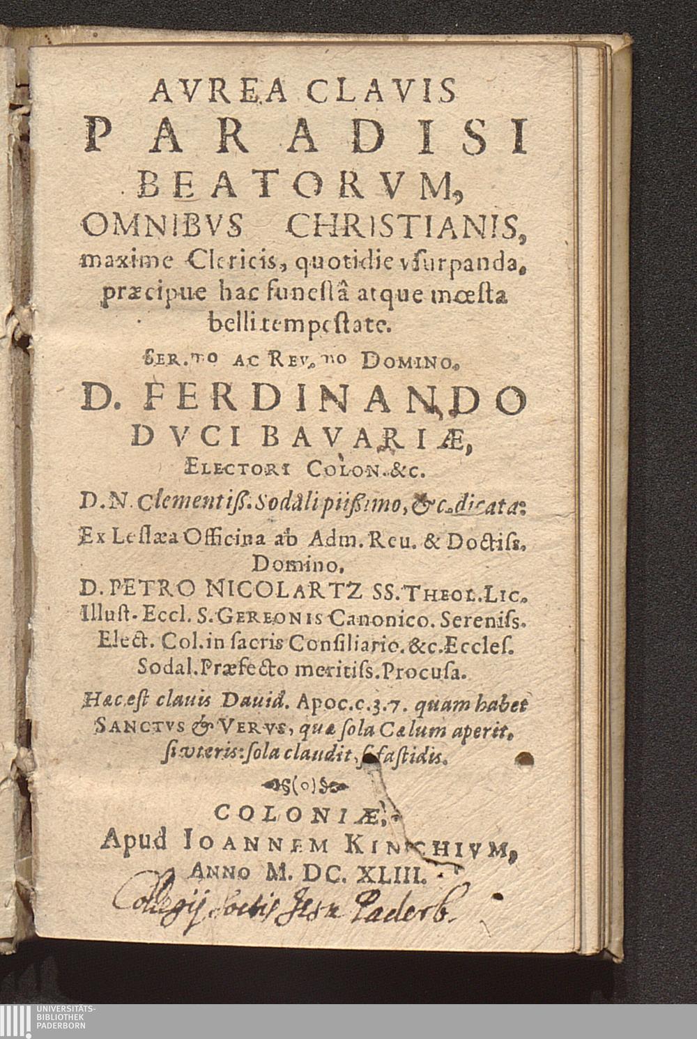 Avrea Clavis Paradisi Beatorvm, Omnibvs Christianis, maxime Clericis, quotidie vsurpanda, praecipue hac funestâ atque moesta belli tempestate / Ex Lessaea Officina ab Adm. Reu. & Doctiss. Domino. D. Petro Nicolartz SS. Theol. Lic. Illust. Eccl. S. Gereonis Canonico ...