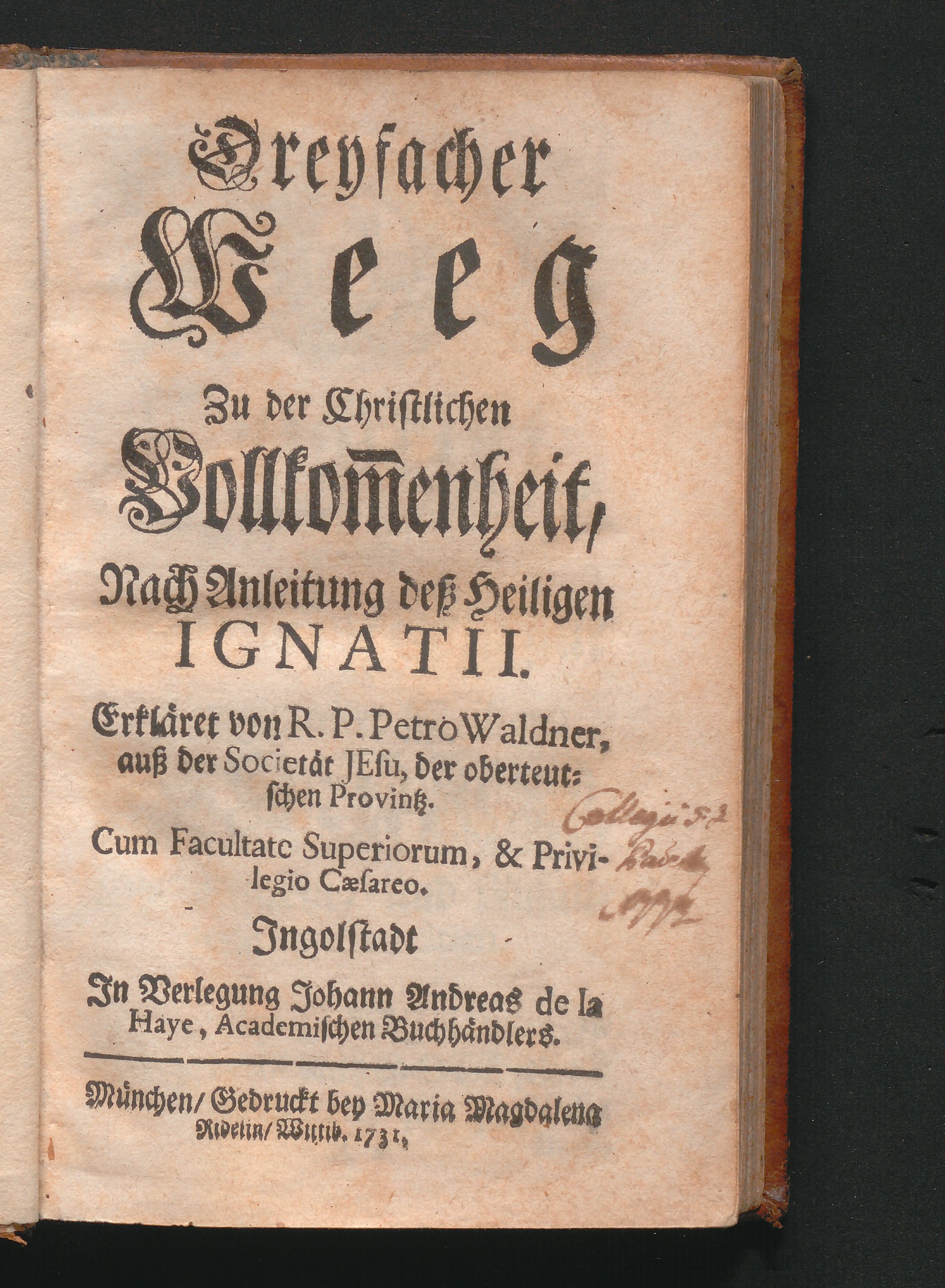 Dreyfacher Weeg Zu der Christlichen Vollkom[m]enheit, Nach Anleitung deß Heiligen Ignatii / Erkläret von R. P. Petro Waldner, auß der Societät Jesu, der oberteutschen Provintz