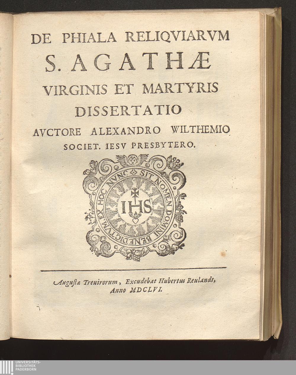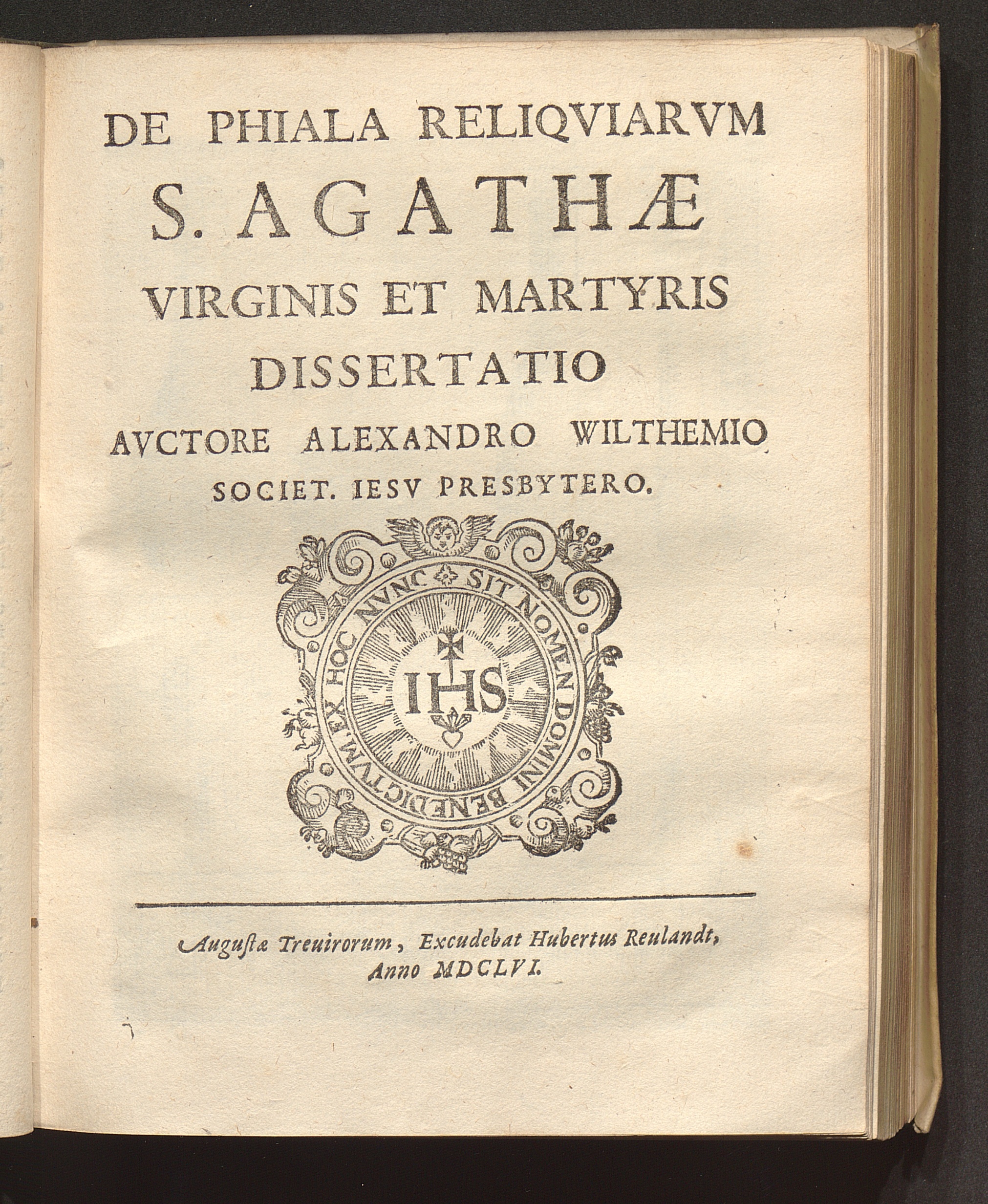 De Phiala Reliqviarvm S. Agathae Virginis Et Martyris Dissertatio / Avctore Alexandro Wilthemio Societ. Iesv Presbytero