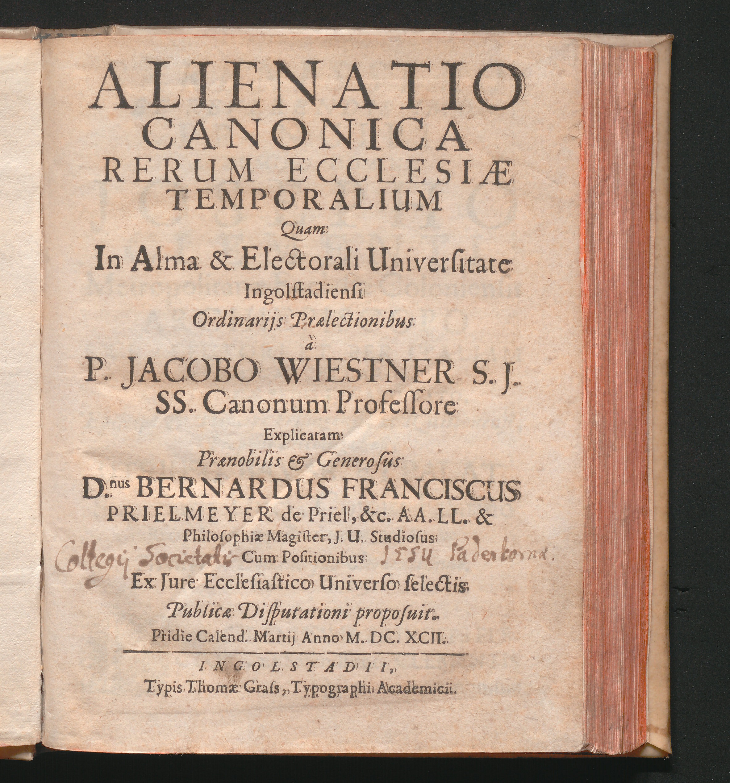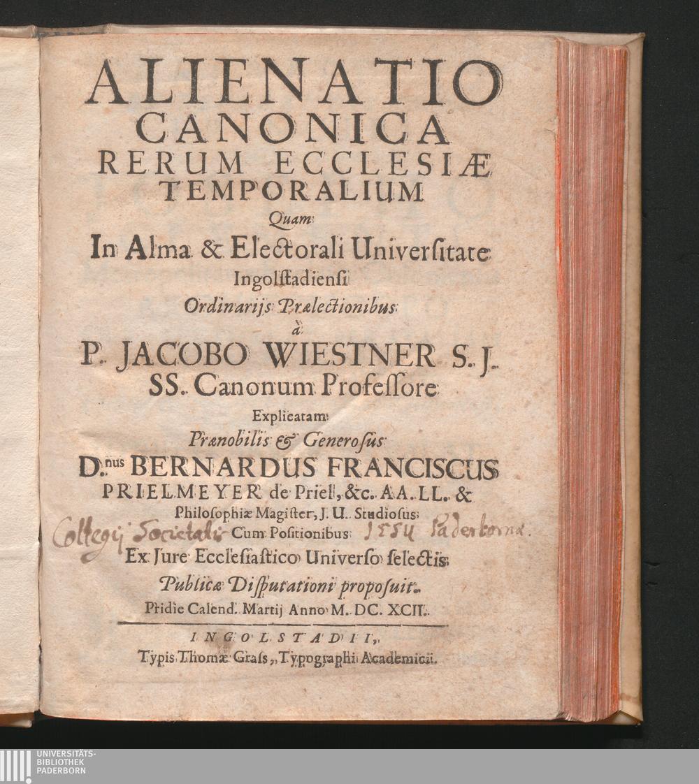 Alienatio Canonica Rerum Ecclesiae Temporalium / Quam In Alma & Electorali Universitate Ingolstadiensi ... a P. Jacobo Wiestner S.J. ... Explicatam ... D.nus Bernardus Franciscus Prielmeyer de Priel ... Cum Positionibus Ex Iure Ecclesiastico Universo selectis Publicae Disputationi proposuit. Pridie Calend. Martii Anno M.DC.XCII.