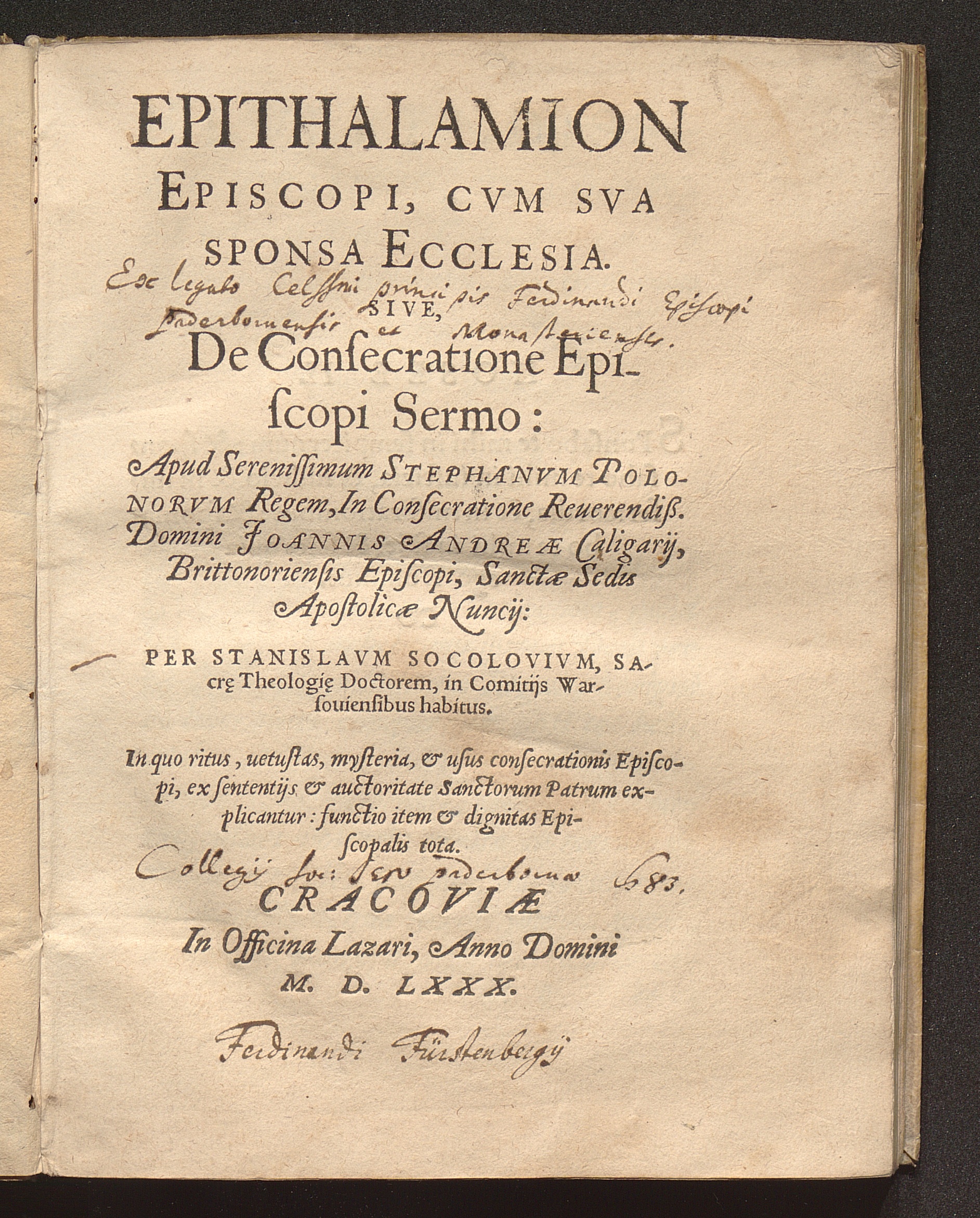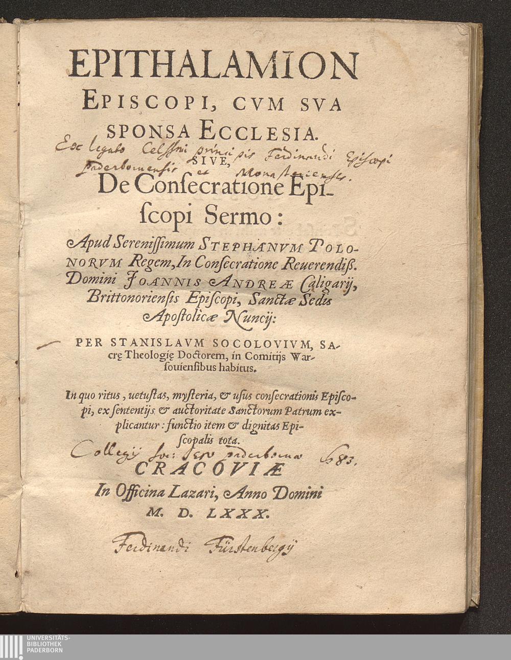 Epithalamion Episcopi, Cvm Sva Sponsa Ecclesia. Sive, De Consecratione Episcopi Sermo : In quo ritus, uetustas, mysteria, & usus consecrationis Episcopi, ex sententijs & auctoritate Sanctorum Patrum explicantur: functio item & dignitas Episcopalis tota / Per Stanislavm Socolovivm, Sacr[a]e Theologi[a]e Doctorem, in Comitijs Warsouiensibus habitus