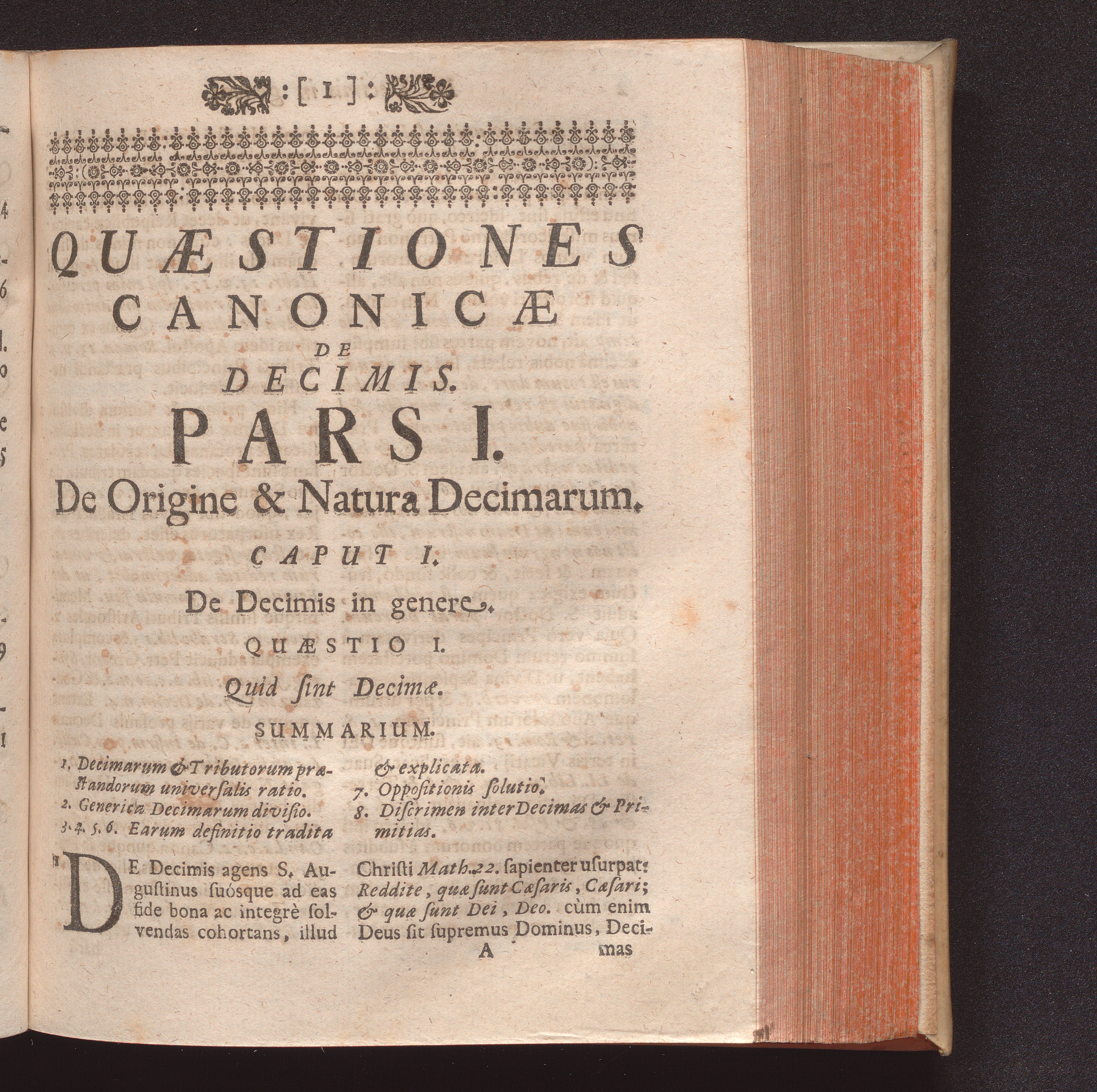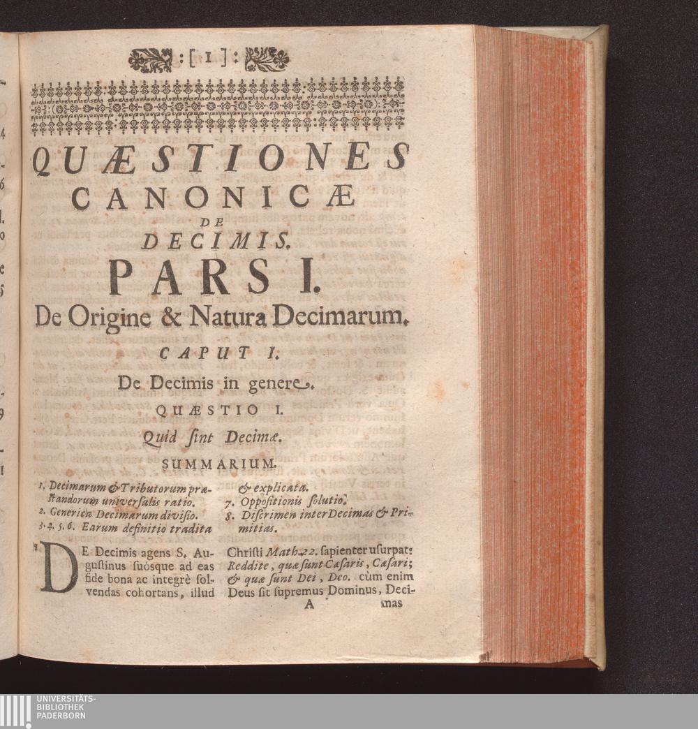 Quæstiones Canonicæ De Decimis : Quibus universum Jus decimandi, quà Ecclesijs, quà Laicis competens, Et Immunitas ab ijsdem solvendis, ex Jure cùm communi, tum consuetudinario, tum etiam Bavariæ Statutis, & Concordatis explicatur ; Accessit geminus Index, unus Quæstionum, alter Rerum & Verborum / Auctore P. Melchiore Friderich Societatis Jesu Sacerdote, & SS. Canonum in Universitate Ingolstadiana Professore
