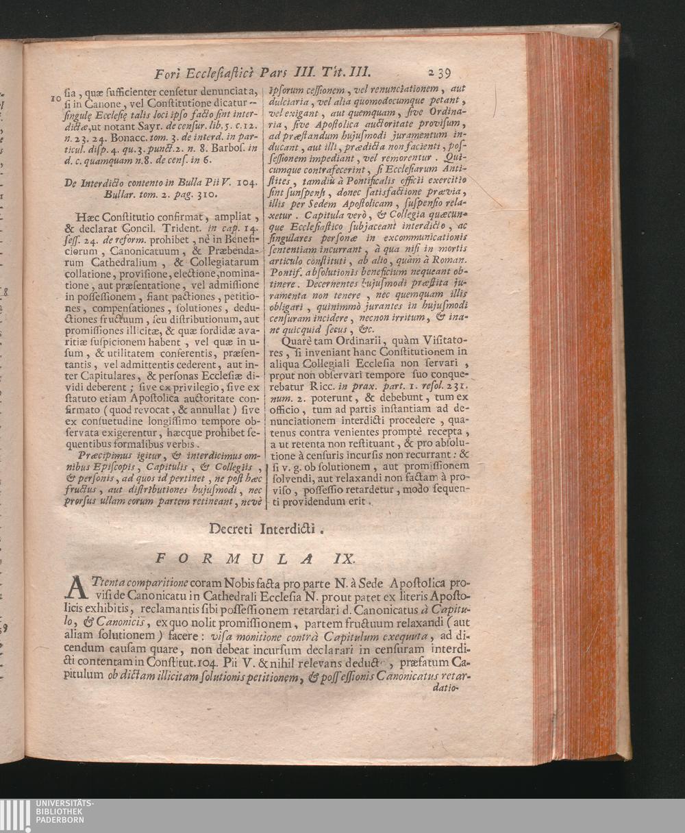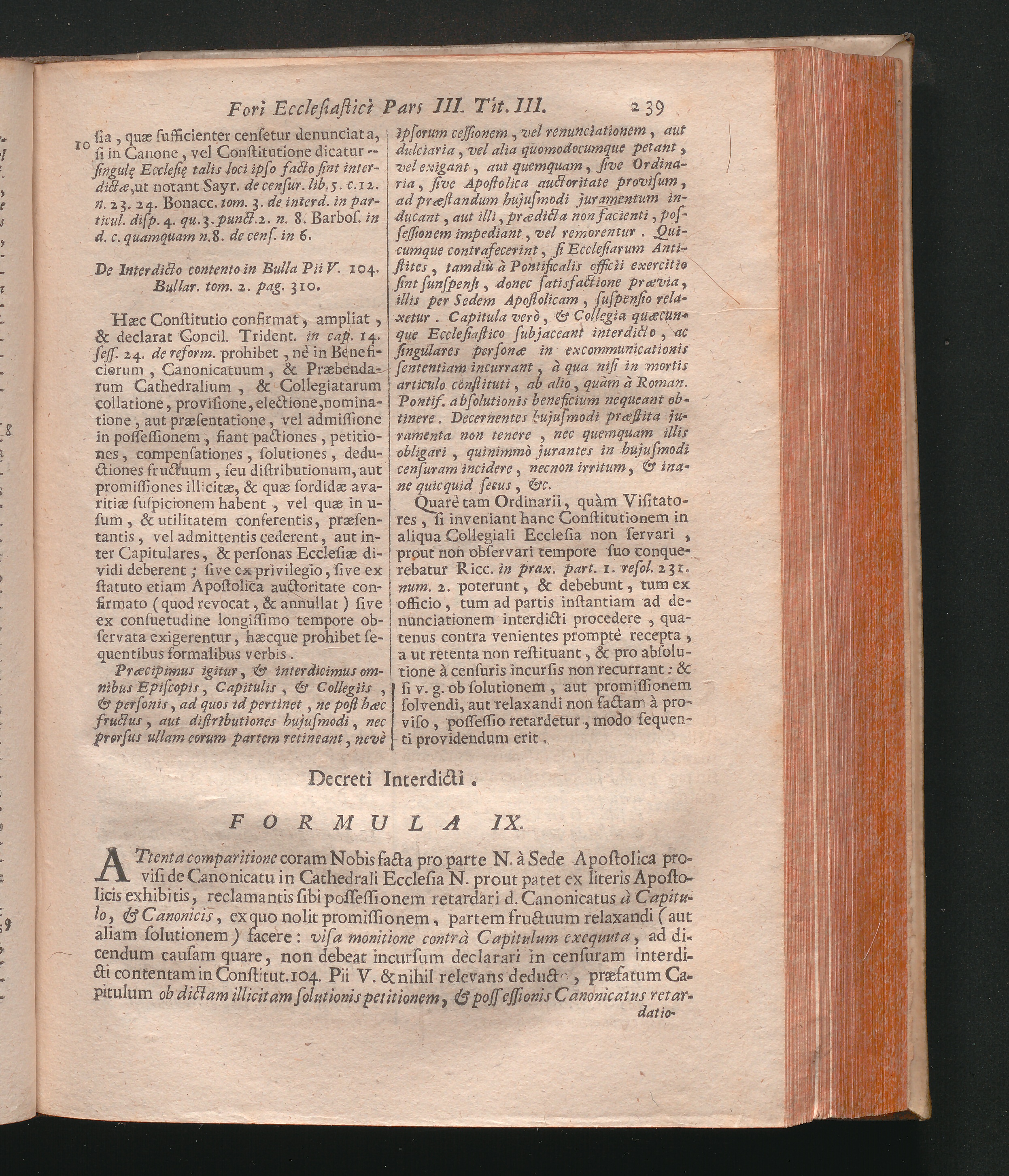 Pars Tertia. (1709) In qua præter formulas Declaratoriarum Censurarum, ponuntur aliæ formulæ, tum Citationum, ac Monitionum pro validitate processuum requisitarum, tum Decretorum, aliorumve actuum ad opportunitatem, & ornatum materiæ incidentium; acceditque in calce Appendix miscellanea, plura, ad Gubernium Ecclesiasticum maximè pertinentia, complectens