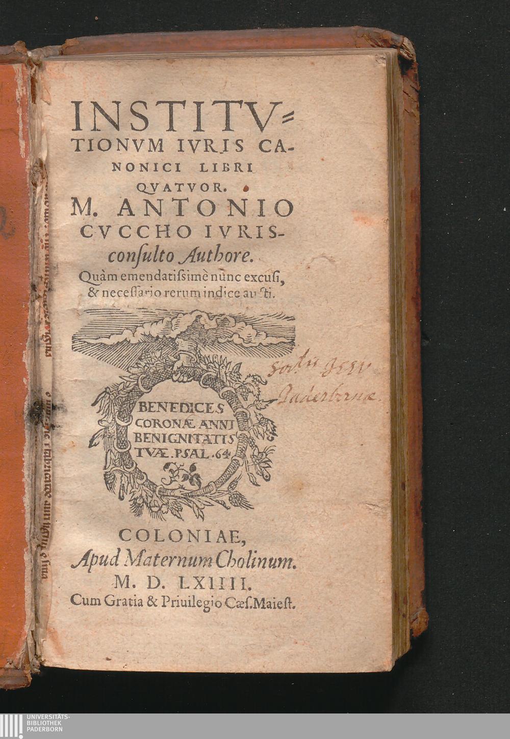INSTITV=||TIONVM IVRIS CA-||NONICI LIBRI|| QVATVOR.|| : Quàm emendatissimè nunc excusi,|| & necessario rerum indice aucti.|| / M. ANTONIO|| CVCCHO IVRIS-||consulto Authore.||