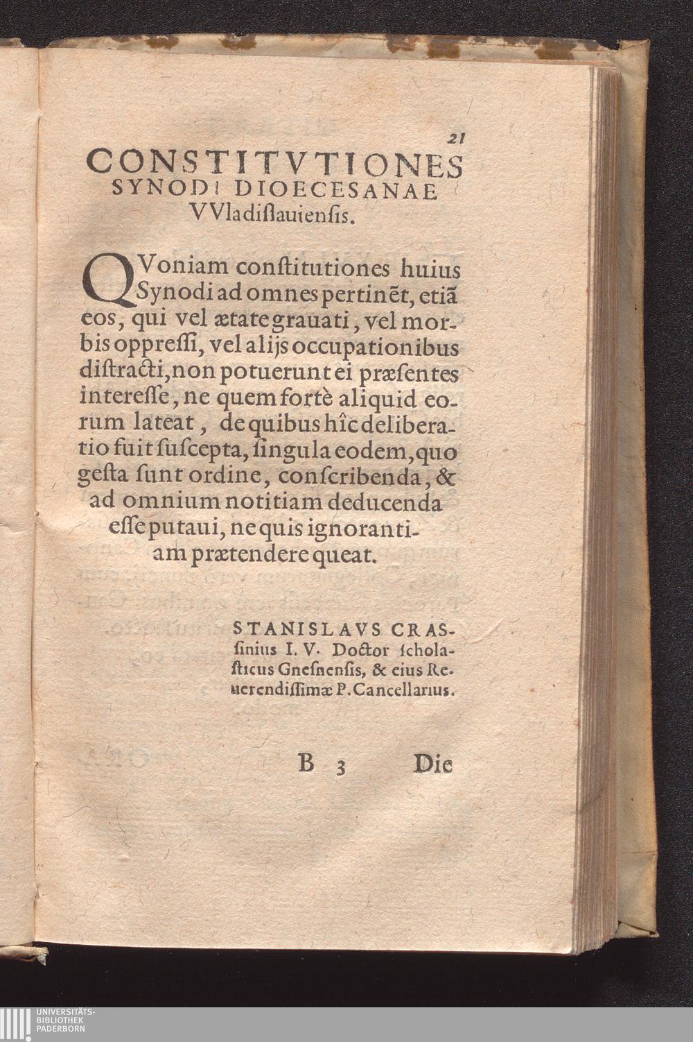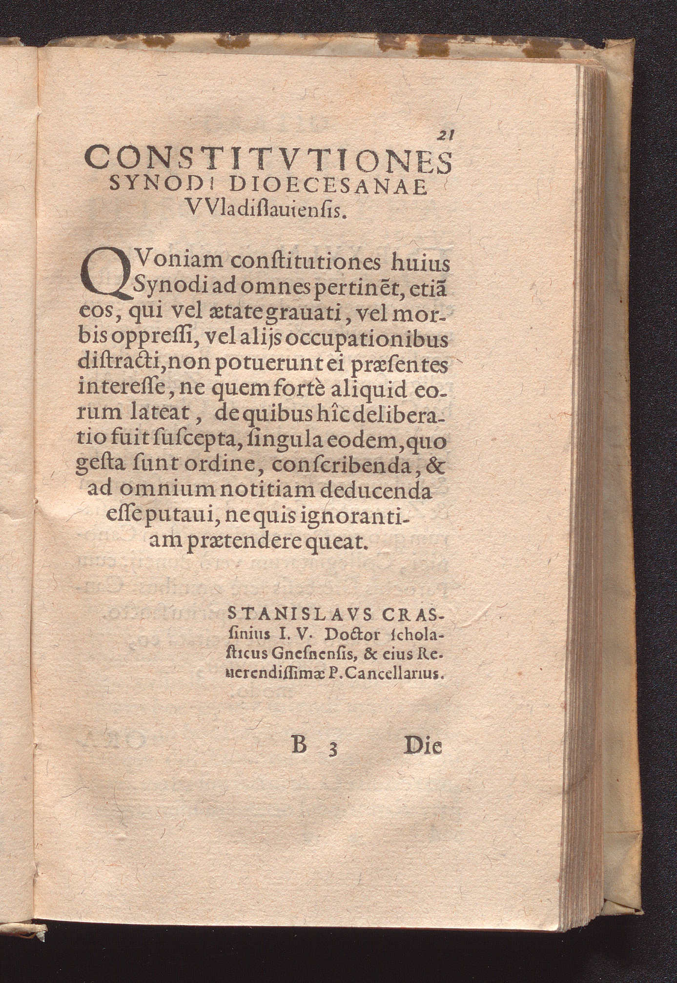 Consti=||tvtiones In Di-||oecesana Synodo Vvla-||dislaviensi : Cum Indice verborum & rerum locuplentissimo / Praesidente Reverendissimo In Christo Patre atque Domino D. Stanislao Carncouio, Episcopo VVladislauensi editæ ; Sub Pontificatu S.D.N. Pii Papae V. ad Sacrosanctæ Sedis Apostolicæ, & vniversalis Ecclesiæ Romanæ gubernacula sedentis