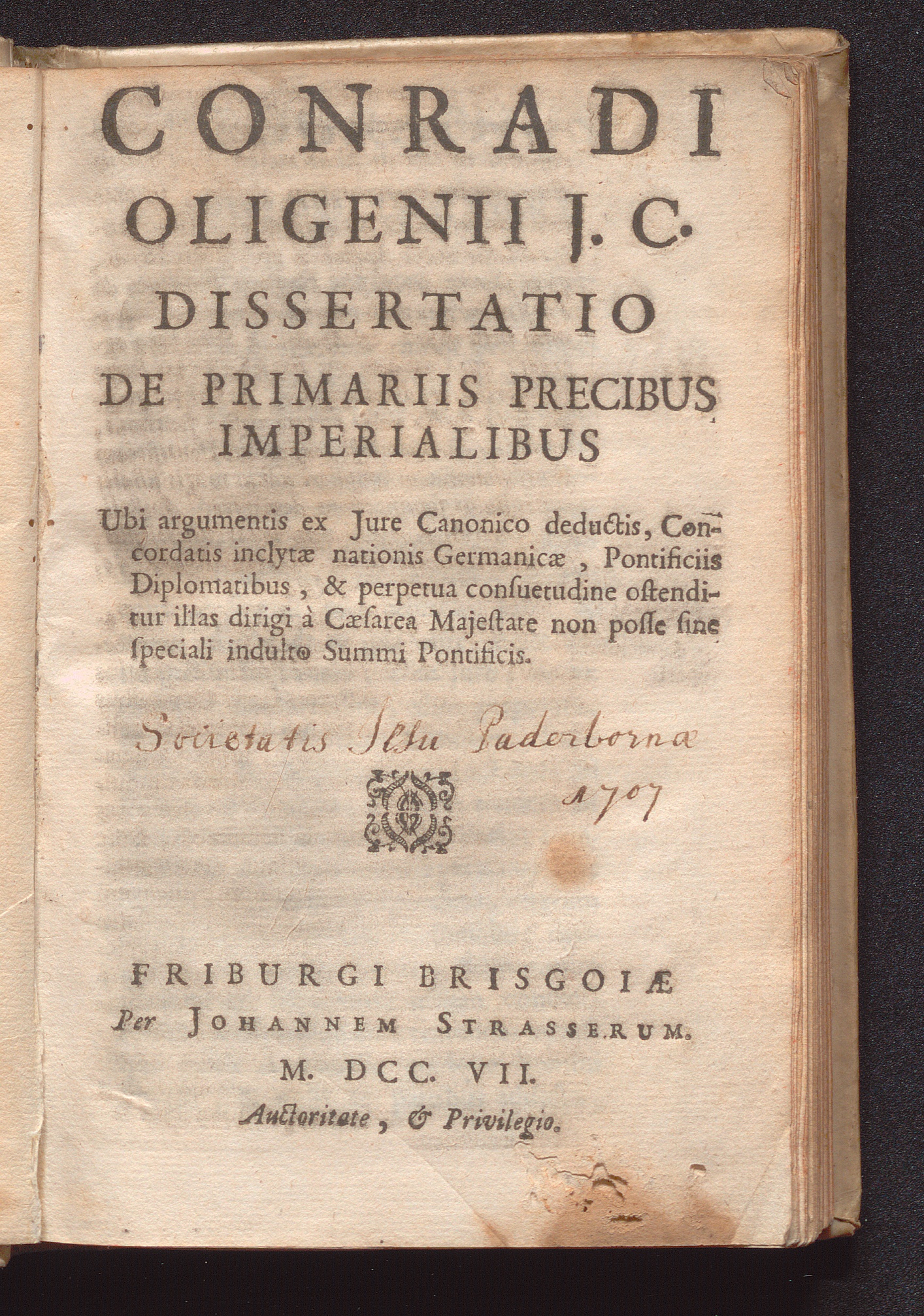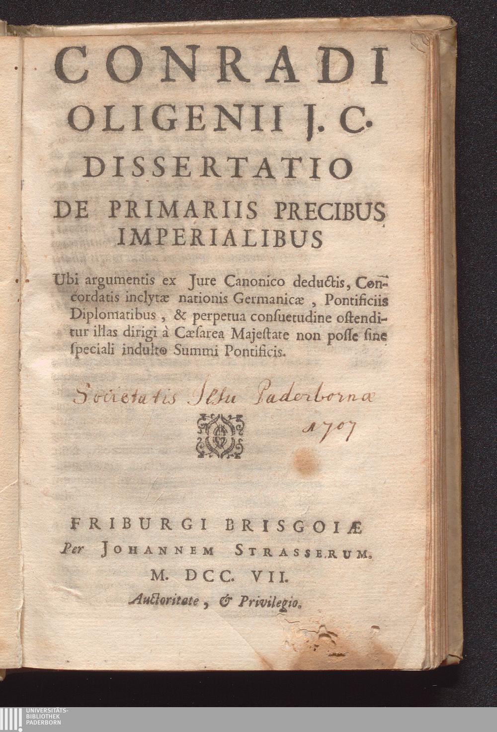 Conradi Oligenii J. C. Dissertatio De Primariis Precibus Imperialibus : Ubi argumentis ex Jure Canonico deductis, Concordatis inclytæ nationis Germanicæ, Pontificiis Diplomatibus, & perpetua consuetudineostenditur illas dirigi à Cæsarea Majestate non posse sine speciali indulto Summi Pontificis