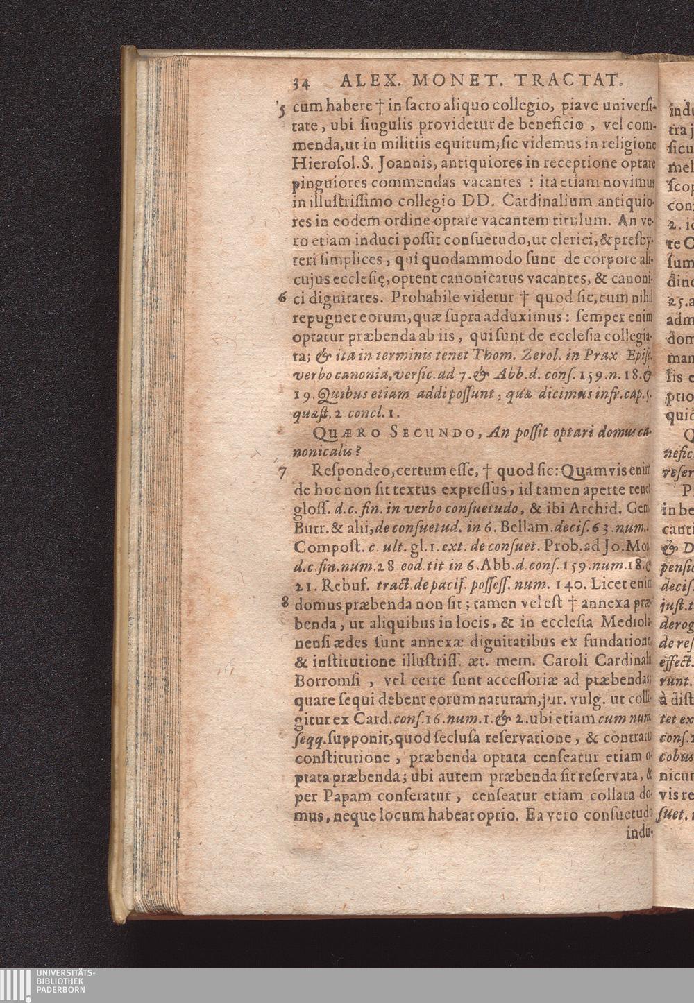 Duo Tractatus : Alter De Optione Canonica: In Qvo De Ivre Optandi, Qvod partim ex consuetudine, partim ex statuto in omnibus jam ferè Ecclesius, tam Cathedralibus, quàm Collegiatus, & nonnullis quoq[ue] aliis Collegius viget, fusè nunc primùm & ordinatim agitur. Alter De Decimis: Tam Spiritvalibvs, Qvæ Ecclesiis ...; Duplici Indice, tum Quæstionum, tum rerum singularium locupletissimo ad quemque Tractatum adiecto / Autore Alexandro Moneta, S. Theologiæ & J.U.D. ac Mediolanensis Ecclesiæ Canonico ordinario