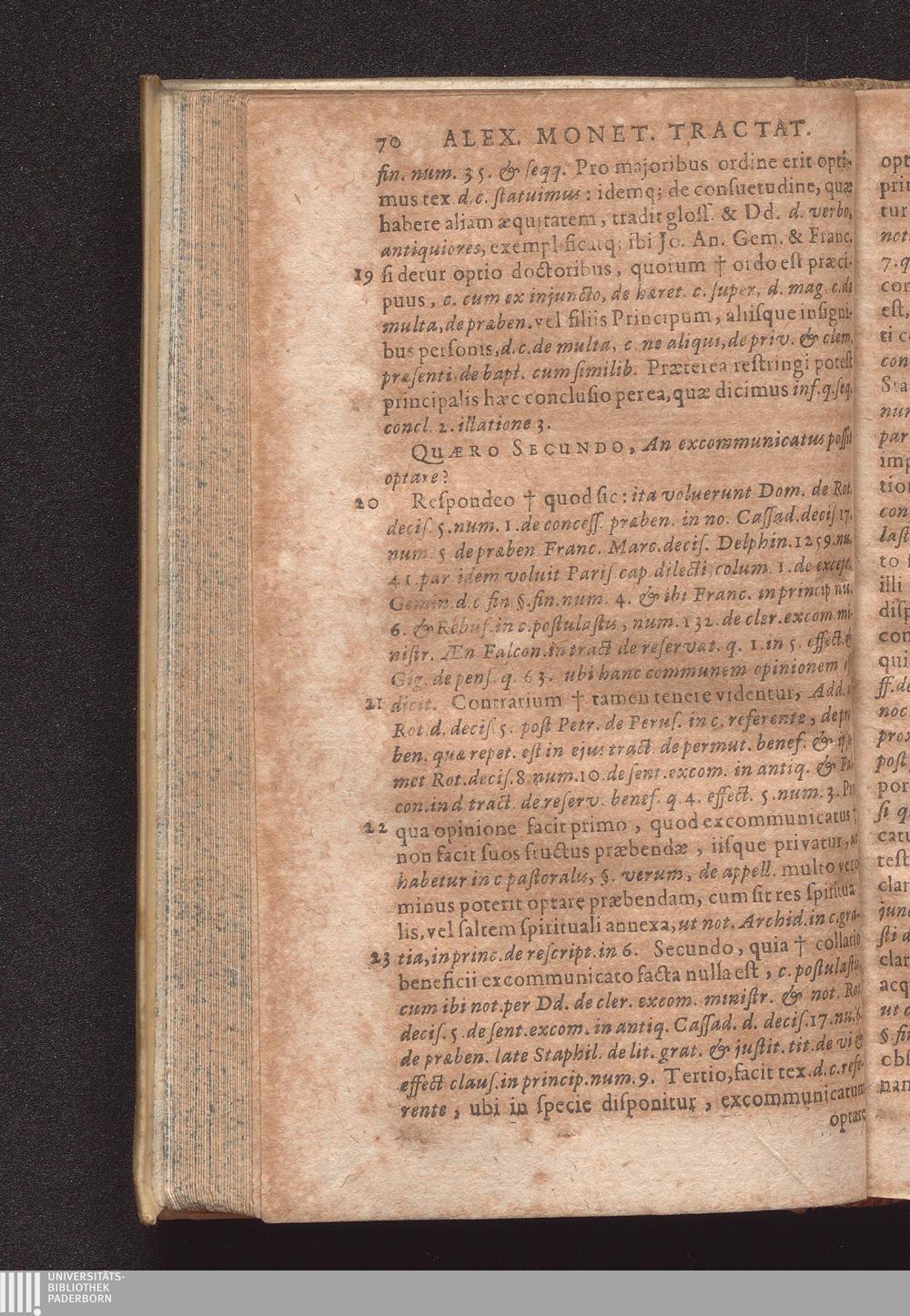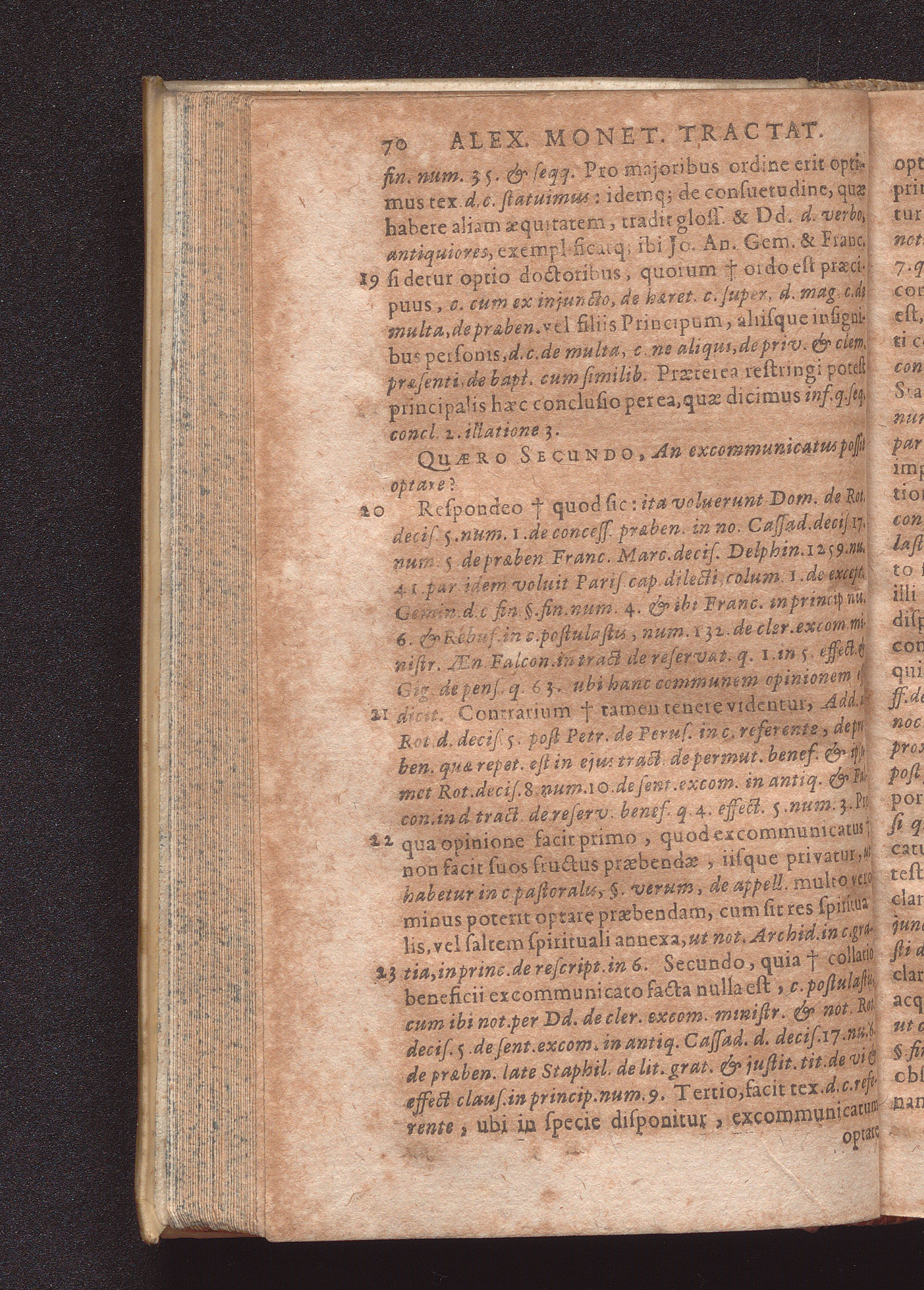 Duo Tractatus : Alter De Optione Canonica: In Qvo De Ivre Optandi, Qvod partim ex consuetudine, partim ex statuto in omnibus jam ferè Ecclesius, tam Cathedralibus, quàm Collegiatus, & nonnullis quoq[ue] aliis Collegius viget, fusè nunc primùm & ordinatim agitur. Alter De Decimis: Tam Spiritvalibvs, Qvæ Ecclesiis ...; Duplici Indice, tum Quæstionum, tum rerum singularium locupletissimo ad quemque Tractatum adiecto / Autore Alexandro Moneta, S. Theologiæ & J.U.D. ac Mediolanensis Ecclesiæ Canonico ordinario