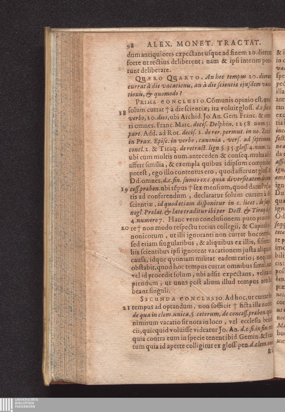 Duo Tractatus : Alter De Optione Canonica: In Qvo De Ivre Optandi, Qvod partim ex consuetudine, partim ex statuto in omnibus jam ferè Ecclesius, tam Cathedralibus, quàm Collegiatus, & nonnullis quoq[ue] aliis Collegius viget, fusè nunc primùm & ordinatim agitur. Alter De Decimis: Tam Spiritvalibvs, Qvæ Ecclesiis ...; Duplici Indice, tum Quæstionum, tum rerum singularium locupletissimo ad quemque Tractatum adiecto / Autore Alexandro Moneta, S. Theologiæ & J.U.D. ac Mediolanensis Ecclesiæ Canonico ordinario
