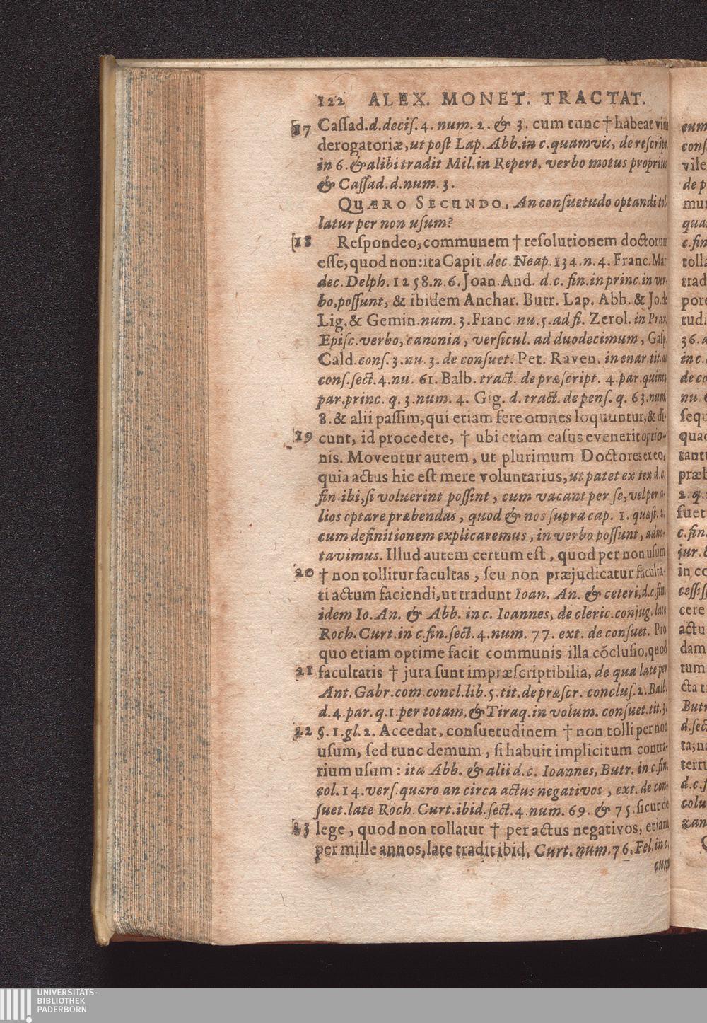 Duo Tractatus : Alter De Optione Canonica: In Qvo De Ivre Optandi, Qvod partim ex consuetudine, partim ex statuto in omnibus jam ferè Ecclesius, tam Cathedralibus, quàm Collegiatus, & nonnullis quoq[ue] aliis Collegius viget, fusè nunc primùm & ordinatim agitur. Alter De Decimis: Tam Spiritvalibvs, Qvæ Ecclesiis ...; Duplici Indice, tum Quæstionum, tum rerum singularium locupletissimo ad quemque Tractatum adiecto / Autore Alexandro Moneta, S. Theologiæ & J.U.D. ac Mediolanensis Ecclesiæ Canonico ordinario