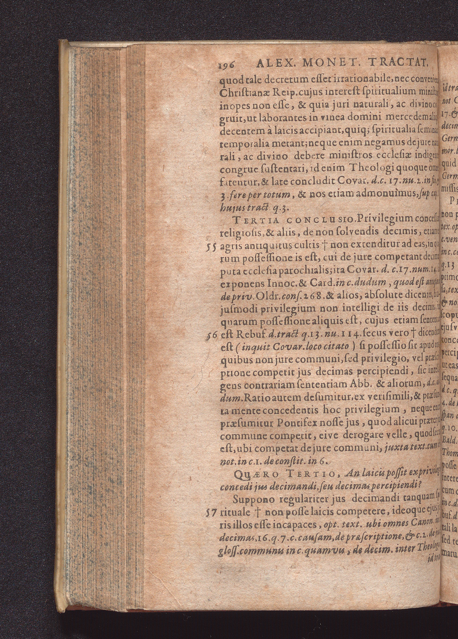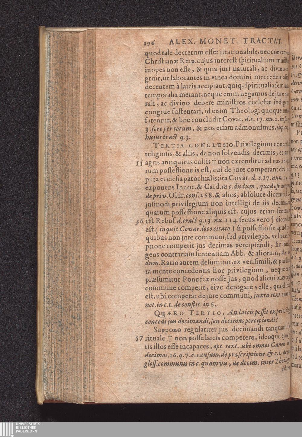 Duo Tractatus : Alter De Optione Canonica: In Qvo De Ivre Optandi, Qvod partim ex consuetudine, partim ex statuto in omnibus jam ferè Ecclesius, tam Cathedralibus, quàm Collegiatus, & nonnullis quoq[ue] aliis Collegius viget, fusè nunc primùm & ordinatim agitur. Alter De Decimis: Tam Spiritvalibvs, Qvæ Ecclesiis ...; Duplici Indice, tum Quæstionum, tum rerum singularium locupletissimo ad quemque Tractatum adiecto / Autore Alexandro Moneta, S. Theologiæ & J.U.D. ac Mediolanensis Ecclesiæ Canonico ordinario
