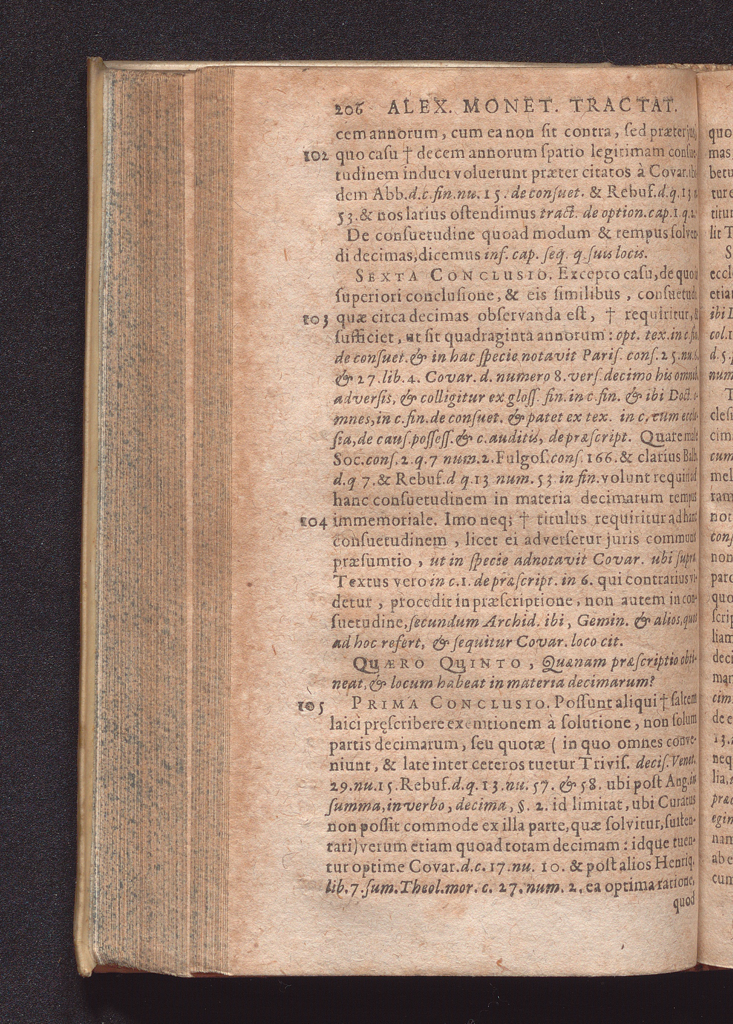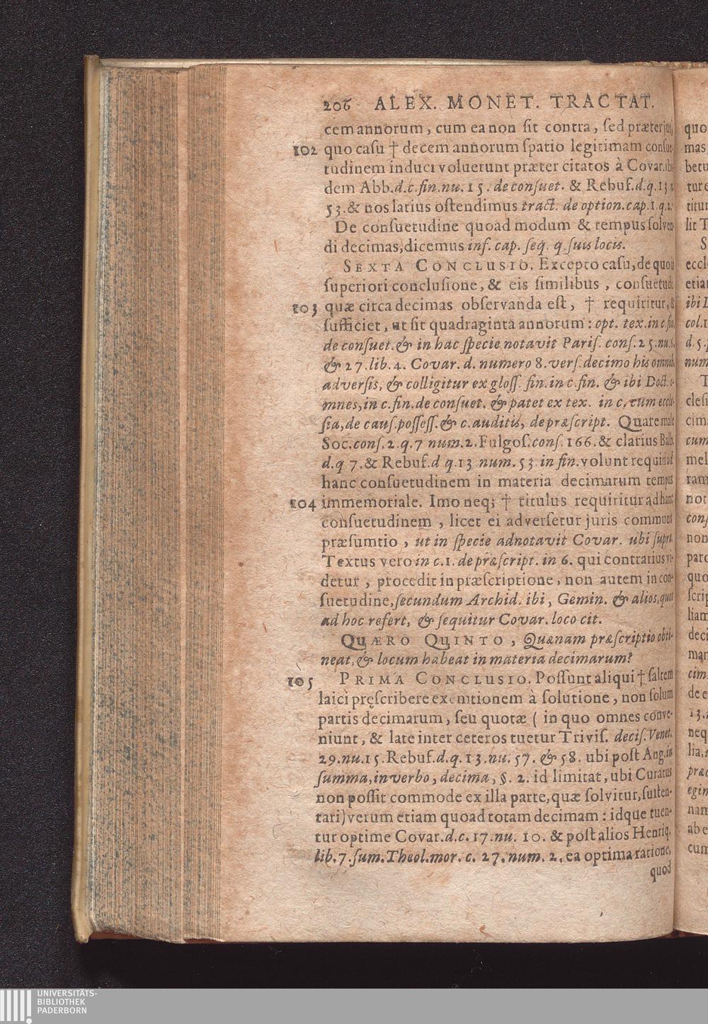 Duo Tractatus : Alter De Optione Canonica: In Qvo De Ivre Optandi, Qvod partim ex consuetudine, partim ex statuto in omnibus jam ferè Ecclesius, tam Cathedralibus, quàm Collegiatus, & nonnullis quoq[ue] aliis Collegius viget, fusè nunc primùm & ordinatim agitur. Alter De Decimis: Tam Spiritvalibvs, Qvæ Ecclesiis ...; Duplici Indice, tum Quæstionum, tum rerum singularium locupletissimo ad quemque Tractatum adiecto / Autore Alexandro Moneta, S. Theologiæ & J.U.D. ac Mediolanensis Ecclesiæ Canonico ordinario