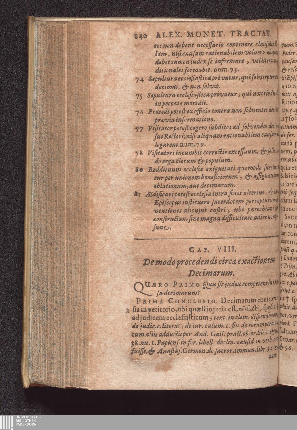 Duo Tractatus : Alter De Optione Canonica: In Qvo De Ivre Optandi, Qvod partim ex consuetudine, partim ex statuto in omnibus jam ferè Ecclesius, tam Cathedralibus, quàm Collegiatus, & nonnullis quoq[ue] aliis Collegius viget, fusè nunc primùm & ordinatim agitur. Alter De Decimis: Tam Spiritvalibvs, Qvæ Ecclesiis ...; Duplici Indice, tum Quæstionum, tum rerum singularium locupletissimo ad quemque Tractatum adiecto / Autore Alexandro Moneta, S. Theologiæ & J.U.D. ac Mediolanensis Ecclesiæ Canonico ordinario