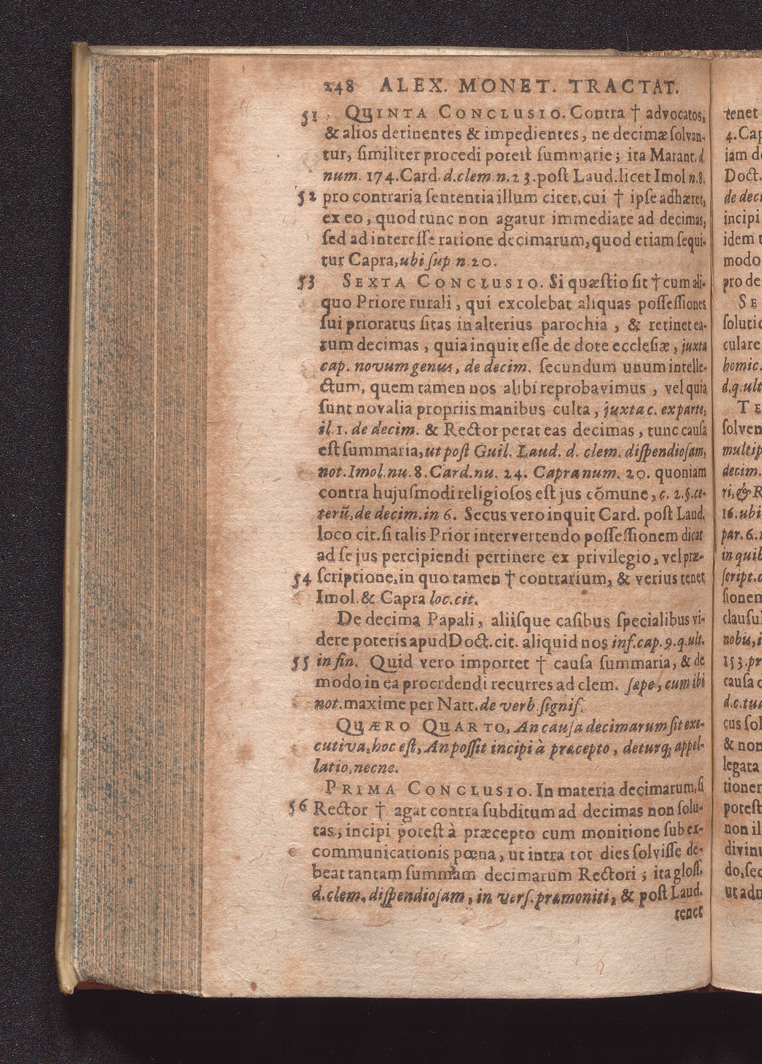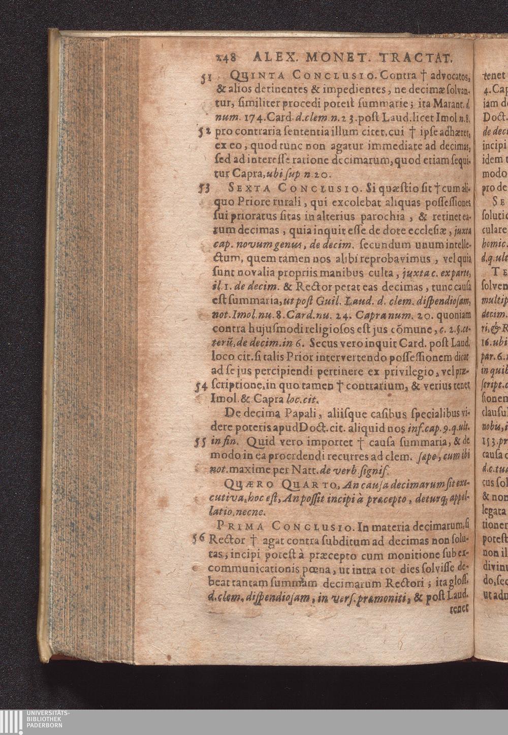 Duo Tractatus : Alter De Optione Canonica: In Qvo De Ivre Optandi, Qvod partim ex consuetudine, partim ex statuto in omnibus jam ferè Ecclesius, tam Cathedralibus, quàm Collegiatus, & nonnullis quoq[ue] aliis Collegius viget, fusè nunc primùm & ordinatim agitur. Alter De Decimis: Tam Spiritvalibvs, Qvæ Ecclesiis ...; Duplici Indice, tum Quæstionum, tum rerum singularium locupletissimo ad quemque Tractatum adiecto / Autore Alexandro Moneta, S. Theologiæ & J.U.D. ac Mediolanensis Ecclesiæ Canonico ordinario