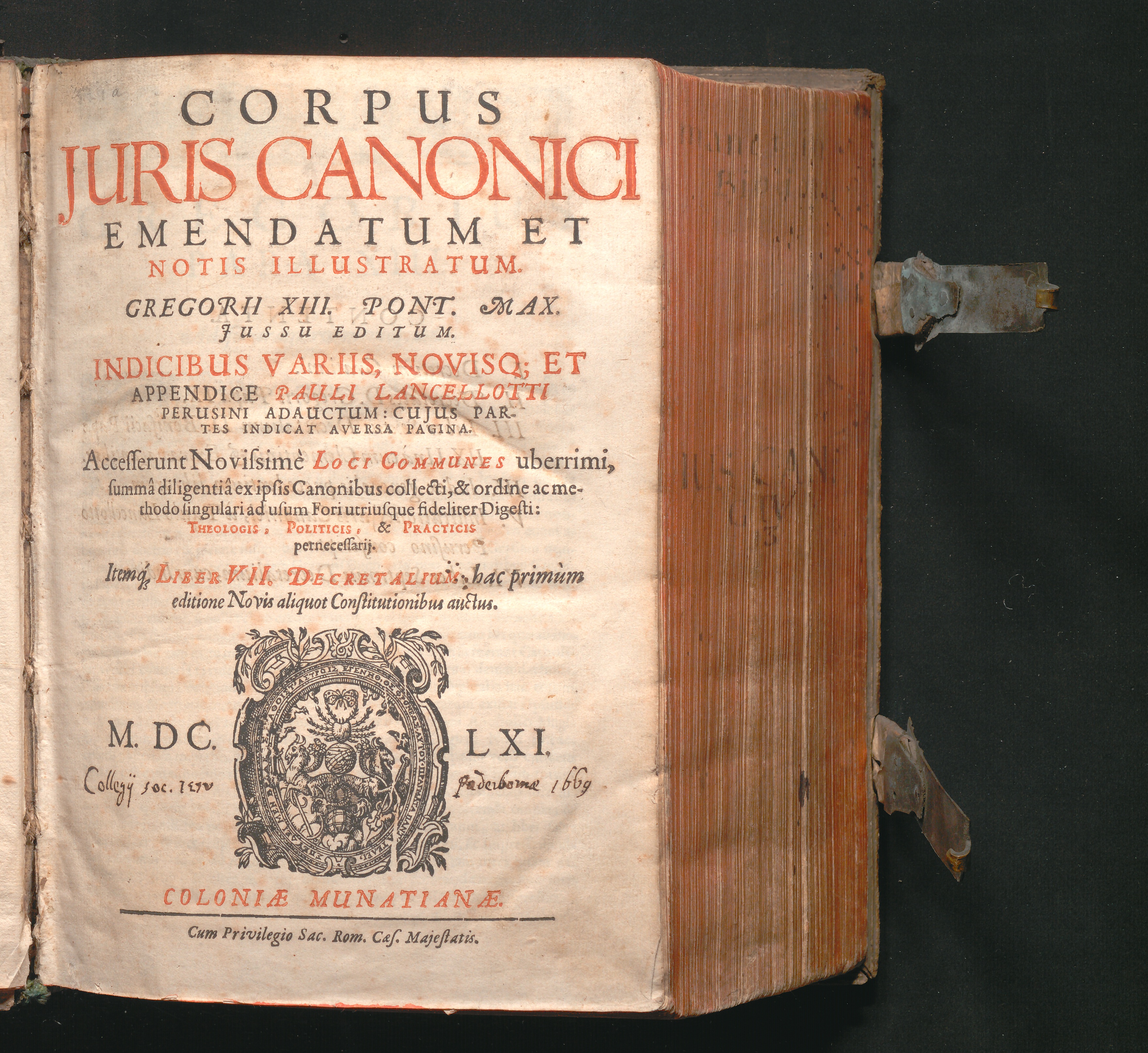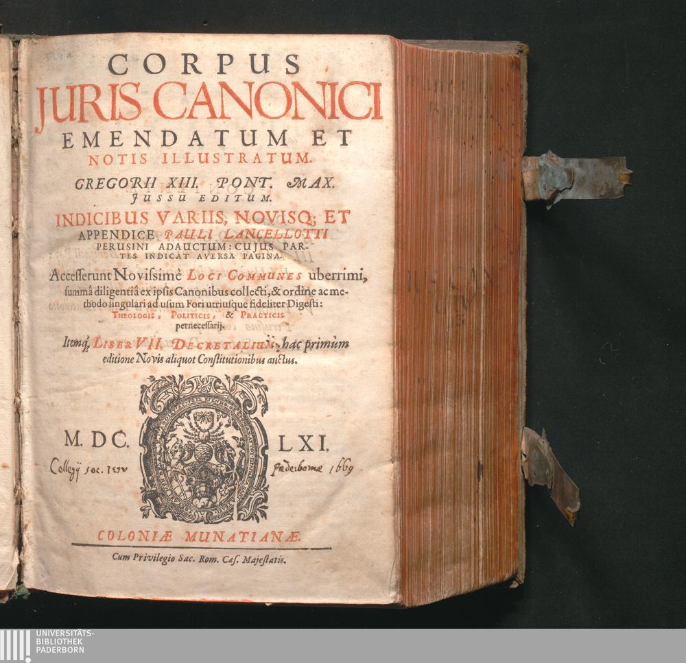 Corpus Juris Canonici : Emendatum Et Notis Illustratum. Indicibus Variis, Novisq[ue] Et Appendice Pauli Lancelotti Perusini Adauctum: Cujus Partes Indicat Aversa Pagina. Accesserunt Novissimè Loci Communes uberrimi, summâ diligentiâ ex ipsis Canonibus collecti, & ordine ac methodo singulari ad usum Fori utriusque fideliter Digesti: Theologis, Politicis, & Practicis pernedessarij. Itemq[ue] Liber VII. Decretalium hac primùm editione Novis aliquot Constitutionibus auctus / Gregorii XIII. Pont. Max. Jussu Editum